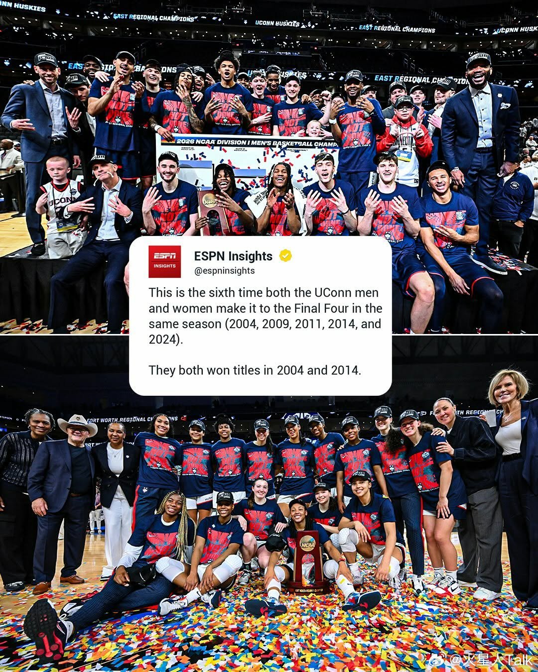 2025-2026赛季NCAA男篮NCAA女篮疯狂三月 康涅狄格大学校史第六次男篮和女篮进入都Final Four最终四强,2004年和2014年共同夺冠,今年还会上演?