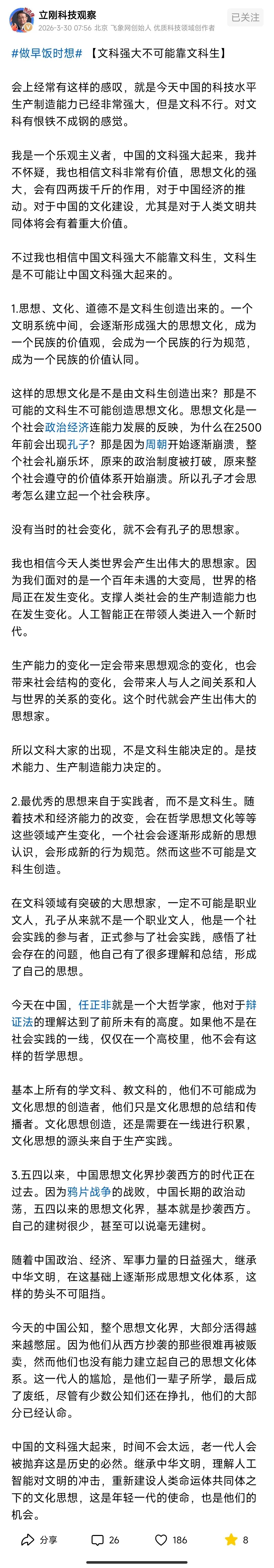 项立刚:文科强大不可能靠文科生。这个观点我不同意。 项立刚的观点看似立足现实、逻辑自洽,实则割裂了实践与理论、创造与传播、历史与当下的联系,存在多处片面化、绝对化的认知误区,既误解了文科的本质,也低估了文科生的价值,更曲解了思想文化诞生与发展的完整规律。 首先,思想文化绝非单纯由社会经济技术被动决定,文科生始终是思想提炼、体系化、传承创新的核心力量。他认为思想是社会政治经济的反映,文科生无法创造思想,这混淆了 “思想素材” 与 “思想成果” 的区别。社会变局确实是思想诞生的土壤,但孔子、诸子百家并非只靠观察社会就形成理论,他们需要对历史典籍梳理、对社会现象思辨、对价值理念系统化建构,这正是典型的文科工作。没有文科的逻辑、修辞、伦理、历史研究能力,零散的实践感悟永远无法升华为可传承、可指导社会的思想体系。现代文科生同样如此,哲学研究者提炼实践中的价值逻辑,法学学者构建社会规则,文学艺术工作者凝聚民族精神,新闻传播者引导公共共识,这些都是直接参与思想文化创造,而非单纯总结传播。 其次,实践者的思想离不开文科的支撑,二者绝非对立关系。他推崇任正非等实践者的哲学思想,却忽视了这些思想本质上是文科思维与实践经验的结合。辩证法、管理学、人文关怀,本身就是文科知识体系的核心内容。没有文科提供的理论工具、思维框架,实践者的感悟只能是零散经验,无法形成系统思想。同时,职业文人、文科研究者并非脱离实践,当代文科从业者深入乡村调研社会治理、参与法治建设完善制度、投身文化传承挖掘本土价值,都是一线实践。把实践者与文科生对立起来,否定文科从业者的创造性,本质是对文科实践属性的无知。 再者,五四以来中国思想文化并非 “抄袭西方、毫无建树”,这是对百年文科发展的彻底否定。近代中国文科不仅引入西方思想,更在中西碰撞中完成了对传统文化的重构、对民族精神的唤醒、对现代国家理念的塑造。从新文化运动推动思想解放,到马克思主义中国化的理论创新,再到当代中国特色哲学社会科学体系构建,中国文科始终在自主探索,绝非简单照搬西方。所谓 “公知憋屈、思想废纸”,是把少数极端现象等同于整个文科界,无视大批文科工作者立足中国实践、构建本土理论的努力。而中国文化自信的回归,恰恰离不开文科界对传统文化的整理、阐释与现代化转化,这正是文科生的核心贡献。 最后,中国文科的强大,必然离不开文科生,二者是不可分割的共同体。项立刚认为文科生无法让文科强大,割裂了人才与学科的内在联系。文科的理论创新、文化传承、价值引导、国际传播,都需要专业的文科生作为主体力量。实践孕育思想,但只有经过文科的专业化加工、体系化构建、持续性传播,思想才能成为推动社会的力量。人工智能时代的文明重构、人类命运共同体的文化建设,既需要科技实践的支撑,更需要文科工作者思考伦理边界、价值导向、文明对话,这些使命无法脱离文科生独立完成。 总而言之,社会经济技术是思想文化的土壤,而文科与文科生是耕耘土壤、培育果实的核心主体。否定文科生的创造性,就是否定思想体系化、理论化、传承化的关键环节;贬低文科的价值,就是忽视文化对经济、科技、社会的引领作用。中国文科的强大,从来不是抛弃文科生,而是让文科扎根实践、让文科生立足时代,在科技发展与文明转型中,完成属于中国的思想文化创造。