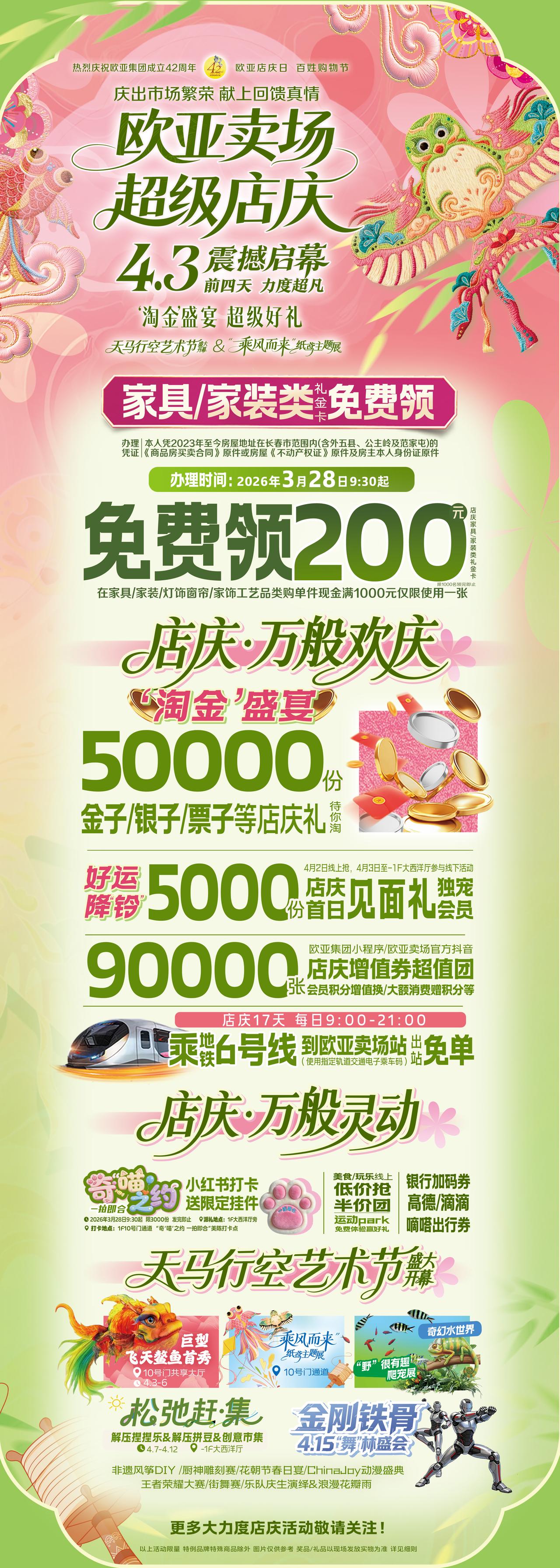 🎉欧亚卖场店庆4月3日震撼启幕!🔥 🏠 家具家装福利:3月28日起,符合条件免费领200元礼金卡!💸 💰 淘金盛宴:5万份金/银/票子等你淘✨,还有9万张增值券超值团!手慢无! 🚇 出行免单:每日9:00~21:00乘地铁6号线到欧亚卖场站,出站即免单!打工人狂喜🥳 🎪 好玩不停:飞天鳌鱼首秀🐠、纸鸢展🪁、市集漫展🎮…嗨够17天! 👉 定好闹钟⏰,千万不要错过这波羊毛呀!