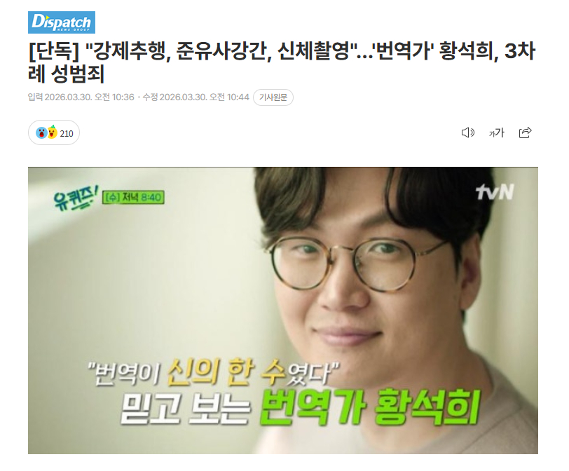 Dispatch追踪了黄锡熙过去的三次犯罪。黄锡熙因强制猥亵致伤、准强奸等嫌疑被起诉两次,最终均被判处缓刑。