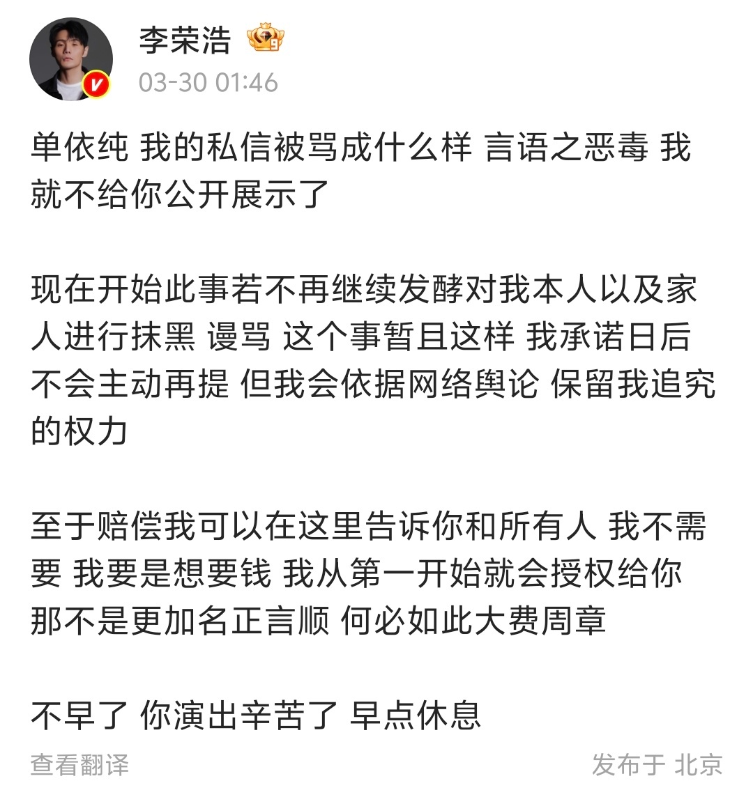 【单依纯就侵权李荣浩道歉】单依纯说错误全在我与任何人无关3月30日凌晨,发长文