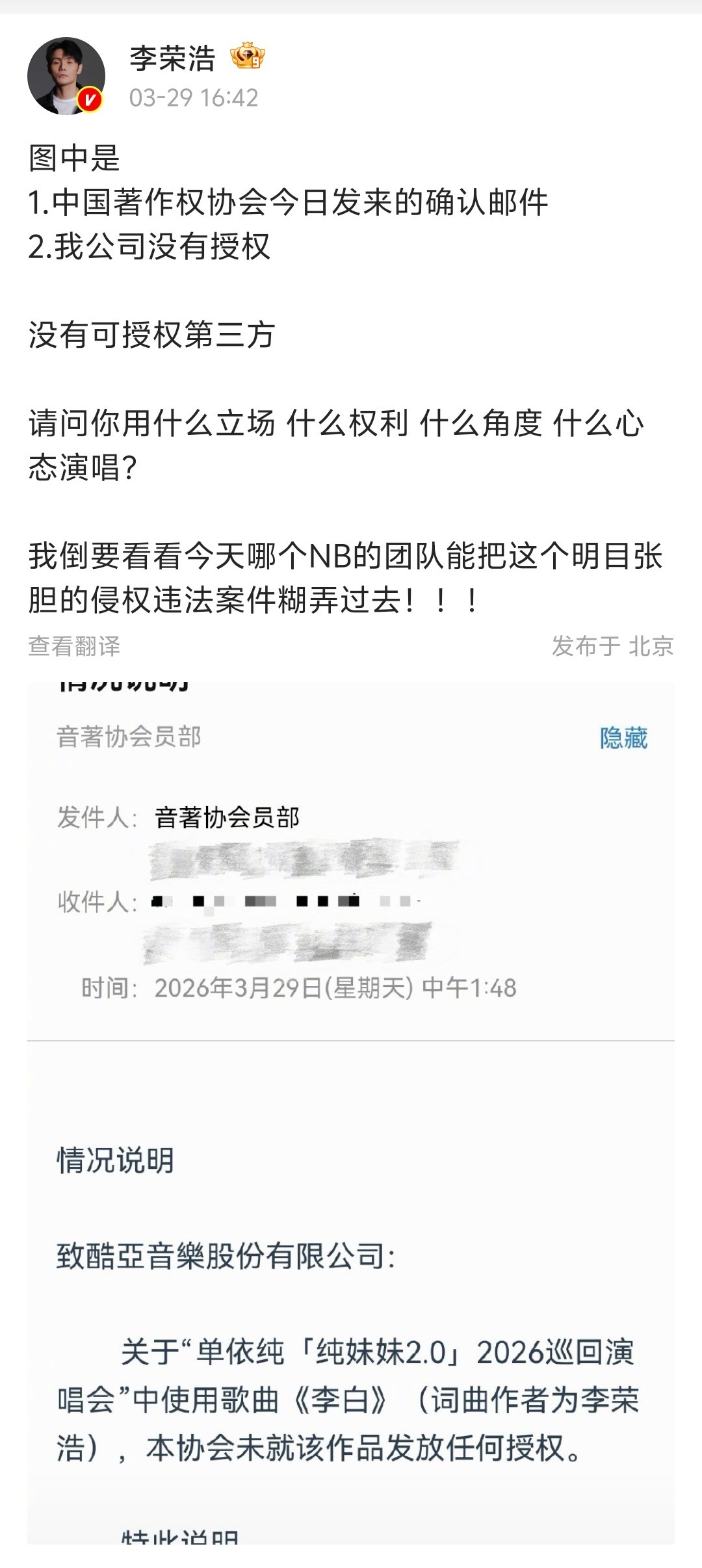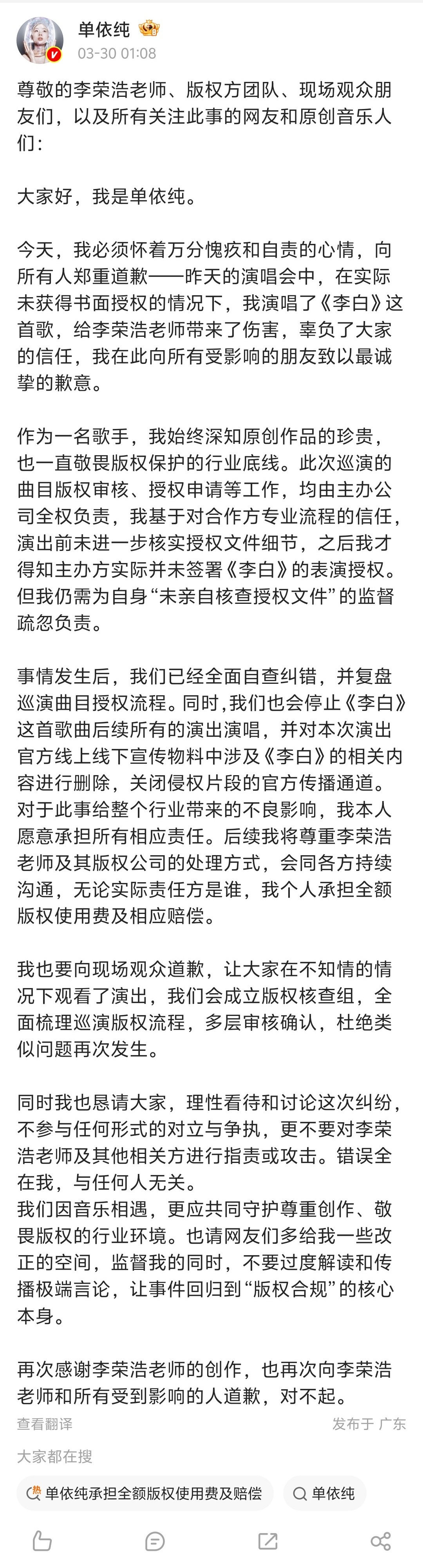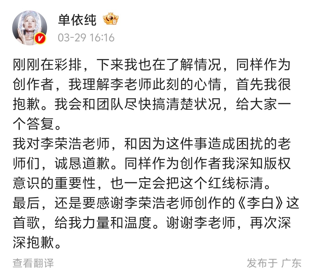 【单依纯就侵权李荣浩道歉】单依纯说错误全在我与任何人无关 3月30日凌晨,发长文就未获授权演唱《李白》道歉:此次巡演的曲目版权审核、授权申请等工作,均由主办公司全权负责,自己演出前未进一步核实授权文件细节,之后才得知主办方实际并未签署《李白》的表演授权。单依纯称,自己愿意承担所有相应责任,后续将停止《李白》所有的演出演唱,并对本次演出官方线上线下宣传物料中涉及《李白》的相关内容进行删除,个人承担全额版权使用费及相应赔偿。同时成立版权核查组,全面梳理巡演版权流程,多层审核确认。此外,单依纯呼吁大家不参与任何形式的对立与争执,更不要对李荣浩及其他相关方进行指责或攻击。“对于此事给整个行业带来的不良影响,我本人愿意承担所有相应责任。”“错误全在我,与任何人无关。”“再次感谢李荣浩老师的创作,也再次向李荣浩老师和所有受到影响的人道歉,对不起。”
