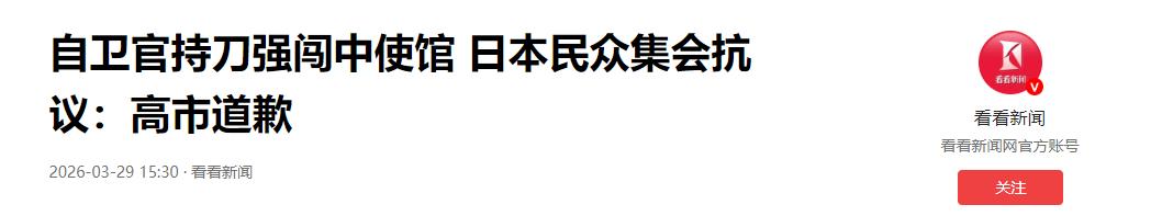 高市早苗真把天捅破了! 几天前,一个自称日本自卫队人员的狂徒,翻墙硬闯中国驻日大使馆,甚至扬言刺杀中方外交人员。被制服后,此人对暗杀企图供认不讳。这是一起极其恶劣的外交事件。 中方态度很明确:严正交涉,强烈抗议,必须严惩肇事者。可高市内阁呢?硬想把这事“大事化小”,拖了几天,只挤出两个字:“遗憾”,没道歉,没问责,装聋作哑。 高市早苗这波操作全是算计,她靠炒作“涉台”议题、对华强硬讨好右翼势力,现在她被架在火上烤:严惩肇事者,右翼基本盘翻脸;继续包庇,中日矛盾激化。她想拖,但民众不答应。 3月28日,东京新宿1400多名民众走上街头,人群里喊得最响的口号是:“高市道歉!小泉道歉!中国对不起!”老百姓眼睛是雪亮的,谁在惹祸大家心里门儿清。 这场集会表面上是为侵馆事件要说法,底色却是彻头彻尾的“反战”。民众不仅喊着让高市下台,更把矛头对准了高市内阁穷兵黩武的政策。日本老百姓真的受够了。 高市天天喊着“中国威胁”,借机推动修宪,疯狂增加军费,还要买远程攻击性武器。这哪是保卫日本?这分明是想搞“再军事化”,把日本重新推回军国主义的深渊。 受美伊战争等影响,日本能源紧张,物价狂飙。老百姓日子快过不下去了,高市却把巨额外汇拿去投资美国、买天价武器。这种不顾民生的倒行逆施,谁能忍? 美国在中东的军事神话已经破灭。看看阿联酋等盟友被卷入战争的惨状,日本老百姓彻底醒了。美国的“安全承诺”根本靠不住,高市死抱美国大腿,就是纯纯的“引火烧身”。 跟着美国混,捞不到好处还得当炮灰。高市内阁的疯狂举动,早引来周边国家强烈警告与反制,地区局势越紧张,日本自身就越危险,这是一种致命的反噬。 新宿街头的抗议只是开始。日本民众的觉醒,已成为制衡高市内阁的最强力量。中方还没施加极限压力,日本内部的民怨就快把高市掀翻了,不用中方动手,日民众先扛起了大旗。 高市早苗现在就是中日关系改善的最大障碍。她那套亲美反华、推动扩军的把戏,不仅威胁亚洲和平,更是拿日本国运豪赌。这笔账,日本民众算得比谁都精。 侵馆事件只是导火索。高市内阁若不给中方一个交代,不给国民一个交代,这把火迟早烧光她的政治生命。只要她还在台上,日本恐再无宁日。接下来,看她怎么收场。