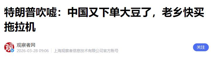 中美会谈结束沉默11天,特朗普突然宣布,中国将再买2000万吨大豆 前段时间,中美第六轮经贸磋商在法国巴黎举行,从3月15号到16号,双方闷头谈了一天半,全程都是闭门会议,没对外透露任何具体内容。 会谈结束后,中方只发了简短的通稿,用八个字定性:“坦诚、深入、建设性”,美方也只说定了后续的工作框架,说白了就是没谈出啥实质性的成果,之后就陷入了沉默,这一沉默就是11天,大家都在猜接下来会有啥动静。 就在大家还在观望的时候,3月27号,特朗普突然在白宫草坪上搞了一场活动,台下站着一群满脸期待的美国农民和牧场主,都是靠种大豆、养牲畜谋生的。 特朗普站在台上,拍着胸脯,语气特别得意地对这些农民说,中国刚刚答应他,要把美国大豆的采购订单从2000万吨翻倍到4000万吨,还笑着鼓励他们:“去买更大的拖拉机吧!”意思就是以后订单多了,他们能多赚钱,能扩大种植规模了。 台下的农民们一听,当场就沸腾了,掌声雷动,一个个都满脸欢喜,觉得终于能把仓库里堆积的大豆卖出去了。他们不知道的是,特朗普嘴里这个4000万吨的大订单,压根就没有任何实际依据,纯属他自己吹出来的牛皮。 就在特朗普说这话的同一天,《南华早报》就报道了,他的这番说法连美国官方数据都支撑不了,美国农业部也没有任何相关的订单记录。 而中国海关公布的今年1到2月的真实数据,更能戳破他的谎言——这两个月,中国从美国进口的大豆,只有149万吨,比去年同期暴跌了80%还多。 大家可以简单算一笔账,4000万吨减去149万吨,差了差不多3851万吨,这个差距大到没法形容,就像大家说的,能装下整个太平洋。 说白了,特朗普就是在给这些农民画大饼,让他们以为马上就能有大订单,就能摆脱困境,可实际上,这些都是假的。 其实,中方并不是不买美国大豆,之前双方达成贸易休战后,美方就说中方承诺在2026年1月前采购1200万吨美国大豆,未来三年每年不低于2500万吨。 中方确实履行了承诺,到今年2月中旬,1200万吨的采购任务已经全部完成,合同签署、装运调度、清关入库,每一步都按流程走完了。 但完成这个承诺之后,中方就暂停了新的订单,从2月底到3月中旬,再也没有从美国买过一粒新的大豆。 这也不能怪中方,毕竟买东西肯定要挑性价比高的。现在巴西的大豆正好到了收获季,不仅产量大,价格还便宜,而且中国从巴西进口大豆,只需要交3%的关税;而美国大豆,还得交13%的关税,算下来采购成本比巴西的高不少。 咱们国内的榨油企业都是做生意的,肯定会选便宜又实惠的,所以之后就把采购重点转到了巴西。今年1到2月,中国从巴西进口的大豆有656万吨,比去年同期增长了82%还多,这就是最真实的情况。 特朗普之所以要吹这个牛,根本原因就是为了自己的选举。美国的农民,尤其是中西部种大豆的农民,是他的核心支持者,也就是他的票仓。 现在美国农民的日子特别不好过,去年收获的大豆还有很多堆在仓库里卖不出去,而且化肥价格涨了40%以上,种植成本越来越高,去年美国农场的破产率都上升了46%,就算有政府补贴,今年的农场收入预计还会下降。 眼看播种季就要到了,农民们都很慌,不知道今年该种多少大豆,也不知道能不能卖出去,特朗普急着出来说这个好消息,就是为了稳住这些农民,让他们继续支持自己。 而且特朗普说的“中国答应翻倍到4000万吨”,压根就没凭据。他自己说“我让他们翻倍,他们就答应了”,但他没说“他们”是谁,也没说在什么场合答应的,中方这边也从来没公开回应过这个4000万吨的数字。 美国大豆协会的负责人也公开说过,1200万吨的订单虽然比没有强,但还不到美国大豆正常出口量的一半,可见特朗普的话有多假。 更有意思的是,就在特朗普宣布这个虚假消息的同一天,中国商务部也做出了反击。 针对美国之前发起的两项301调查,中方对等启动了两项贸易壁垒调查,明确表示对美方的做法强烈不满、坚决反对,会根据调查情况采取相应措施,捍卫自己的正当权益。 你美方一边要我们买你们的大豆,一边又背后捅刀子,搞单边主义,中方肯定不会轻易让步。 特朗普的这番操作,看似稳住了台下的农民,实则根本解决不了美国农民的实际问题。毕竟数据不会说谎,149万吨和4000万吨的差距,不是靠一句吹嘘就能填补的。