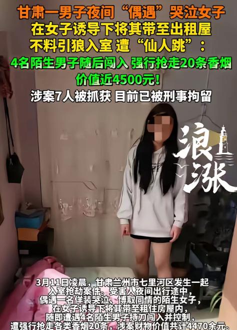 “值得警惕!”兰州,男子深夜在路边遇到一名哭泣的年轻女子,见对方长得漂亮,还称自己无家可归,暗示他将她带回家,以为是遇到了艳遇,哪曾想,男子刚把女子带回出租房,啥还没来的急做,4名持刀男子闯入抢走20条香烟并带走女子。事后报警发现,女子与劫匪实为同伙,男子遭遇“仙人跳”。 这事并不止“女子+4个刀手”这么简单。 男子把人带回租房那一刻,等于把“安全边界”亲手划掉了。 屋里还没来得及反应,人就被控制,香烟被一扫而空,20条,折算下来涉案财物4470余元。 更关键的一点,警方后面查出来这是个7人团伙,分工比想象中细:有人负责在路边“演戏”、有人盯住住址、有人负责持刀冲门、有人负责撤离接应,动作一套接一套。 更让人后背发凉的是他们跑得也快。 作案后当晚就分头逃窜,3人连夜跑去酒泉,4人躲在兰州城里。 警方靠视频追踪加大数据研判,几乎是把路线一点点“拼图”拼出来,12小时内兵分两路抓齐7人,兰州11点左右抓到4个,酒泉12点左右抓到3个,涉案财物也退回给受害人。 这个效率说明一件事:现在的城市治理有“天眼”和数据,犯罪团伙也在升级套路,拼的就是谁更快、更狠、更会算计。 我对这案子的看法很明确:这类“仙人跳”早就不止是老一套的“捉奸敲诈”,已经进化成更直接的暴力侵财。 过去常见的是抓住猎艳心理,摆一出“你做了亏心事,掏钱私了”的戏码;现在不少团伙干脆把戏演到门口,把人引进屋就上刀,上手就抢。 这一转变特别危险,风险不在丢面子,风险在丢命、在家门口被人控制。 很多人会说受害人“自己起了色心”,可能有这个原因在。 但话说回来,深夜路边遇到求助者,动了恻隐之心也正常,真正的问题出在“把陌生人带回私密空间”。 出租房、酒店房间、独居住所,这些地方一旦暴力闯入,受害人天然处于孤立状态,喊不来人、跑不出去、证据也不一定好留。 团伙正是利用这点下手:女子负责把你从公共场所“迁移”到封闭空间,刀手负责把你从有反抗能力“降级”到被动挨宰,撤离的人负责把风险切割干净。 这案子还有个容易被忽略的点:法律后果非常重。警方定性属于暴力入室抢劫,涉嫌抢劫罪。刑法里“入户抢劫”是加重情节之一,起刑点就很高。 对普通人来说,这意味着什么?意味着他们并非临时起意的小打小闹,做的就是奔着重罪去的买卖。对团伙来说,一旦落网代价巨大;对受害人来说,一旦遇上,后果也可能更难承受。 现实里类似套路不只发生在“艳遇”场景。 路边“哭泣求助”、酒吧门口“喝醉被丢下”、打车时“手机没电借充电”、小区楼下“说被家暴求收留”,这些都可能被人拿来当剧本。 关键不是让大家变冷漠,关键是把善意放在安全范围里:帮忙可以在明亮的公共区域,报警、联系救助站、带去派出所门口、请店员一起看着,哪怕给一瓶水、叫一辆网约车,也比把人带回家更稳妥。 真遇到对方反复引导你“去你家坐坐”,还刻意强调“我无处可去”,这就要立刻警觉,脚底抹油比讲义气更现实。 还有个值得讨论的社会心理:很多受害者遇到这类事,第一反应往往是“丢人”“怕被笑”,想着花钱消灾,结果给了团伙继续作案的胆子。 兰州这起案子能快速侦破,一个重要前提就是有人报案、愿意讲清楚经过。对普通人来说,面子可以以后再找,安全只能当场保住。 该报案就报案,该配合就配合,越早越好。 这件事到头来给人的提醒很朴素:陌生人的眼泪不一定无辜,深夜的热心也要带点边界感。 把自己从“可被下手”的位置挪开,很多局就搭不起来。 你们觉得,遇到路边求助的陌生人,怎样帮忙既有人情味又不把自己置于危险?这种“从色诱到持刀”的升级套路,生活里还有哪些相似场景最容易中招?评论区聊聊你的办法。