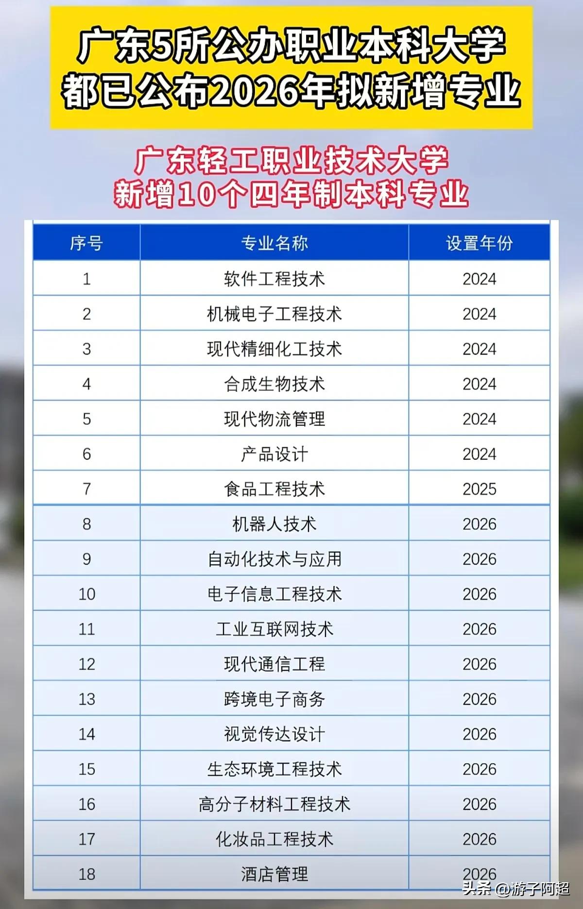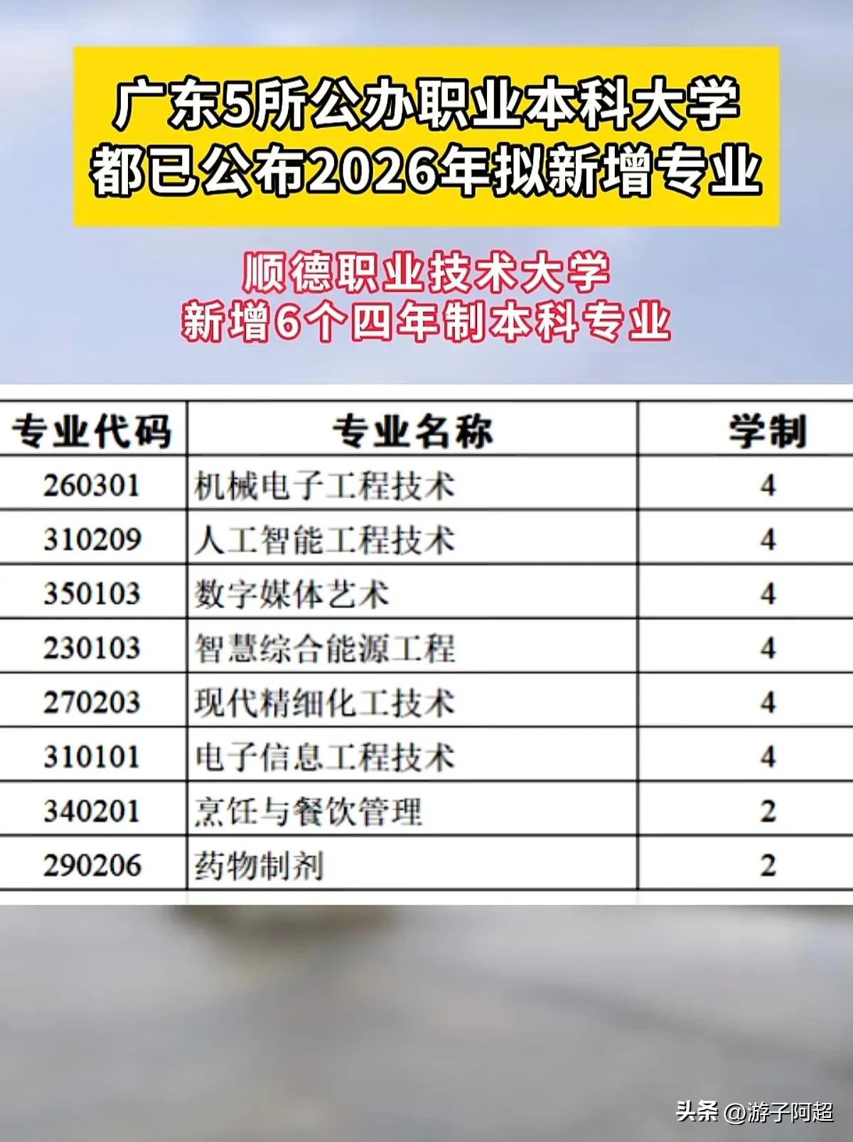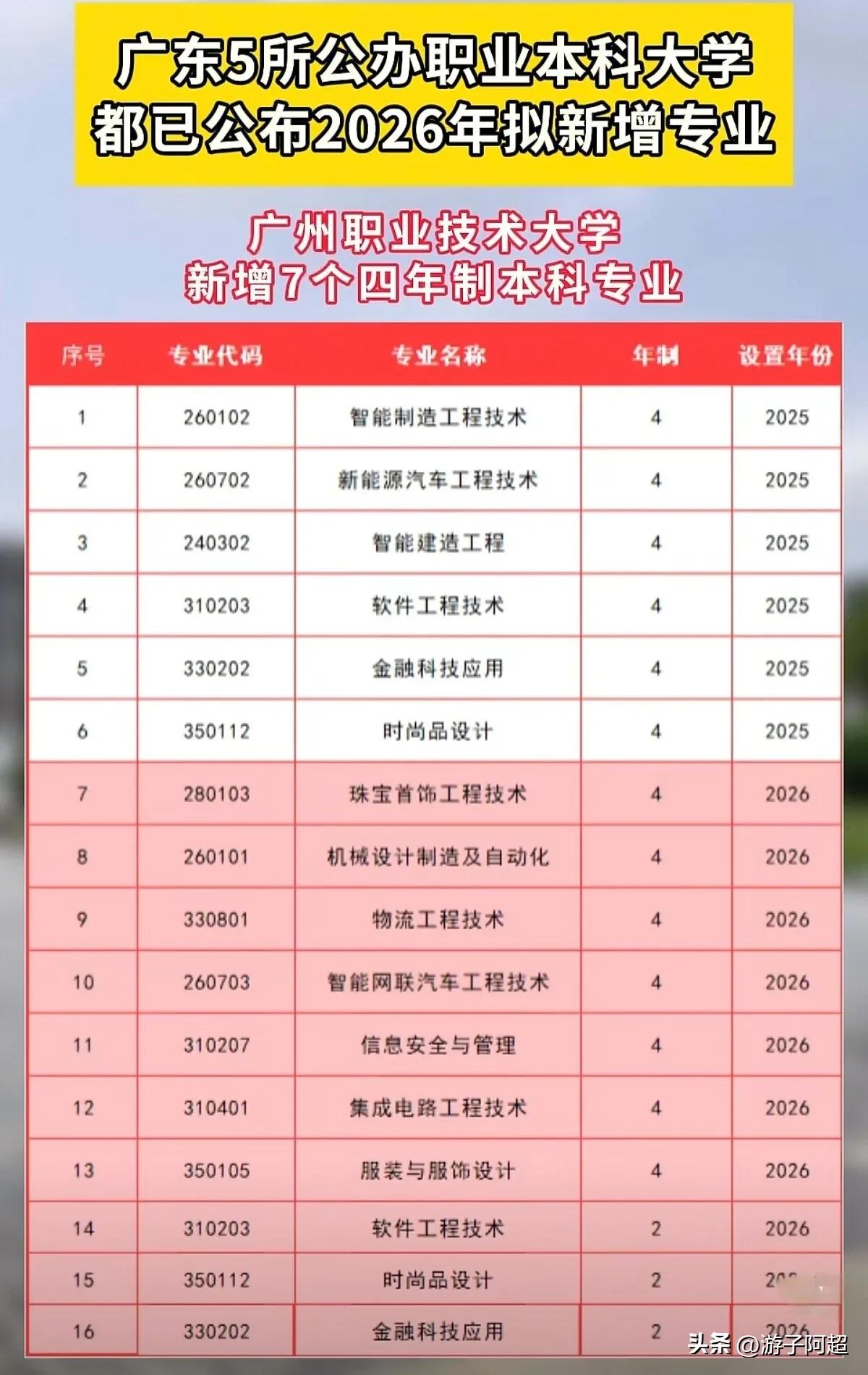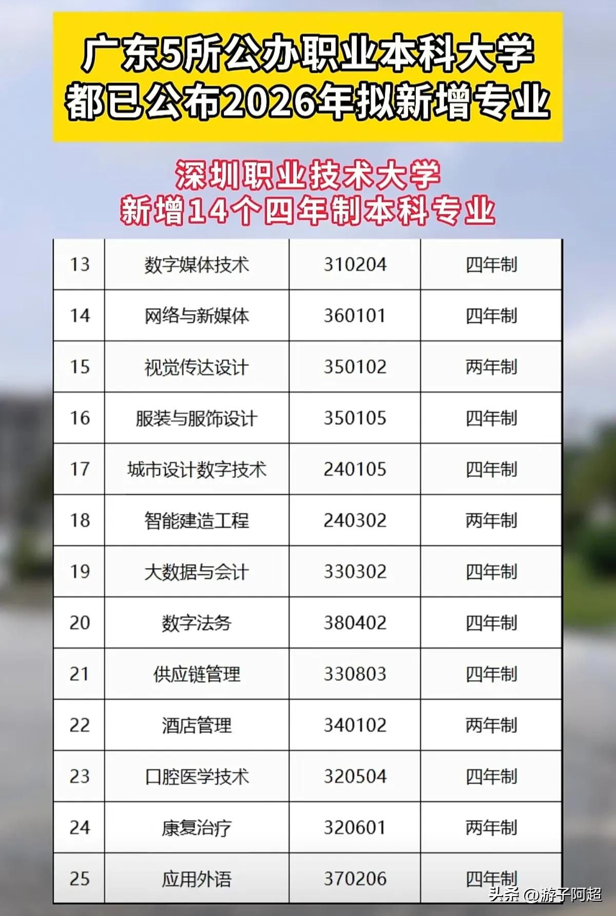 广东省五所公办职业本科大学已公布2026年度新增专业计划。 今年广东省公办职业本科大学呈现专业规模扩张趋势,深圳职业技术大学增设14个四年制本科专业,深圳信息职业技术大学亦新增10个四年制本科专业。 全省现有7所职业本科大学,其中5所为公立性质,2所为民办性质,今年所有5所公办职业本科大校均实施新增专业招生计划。