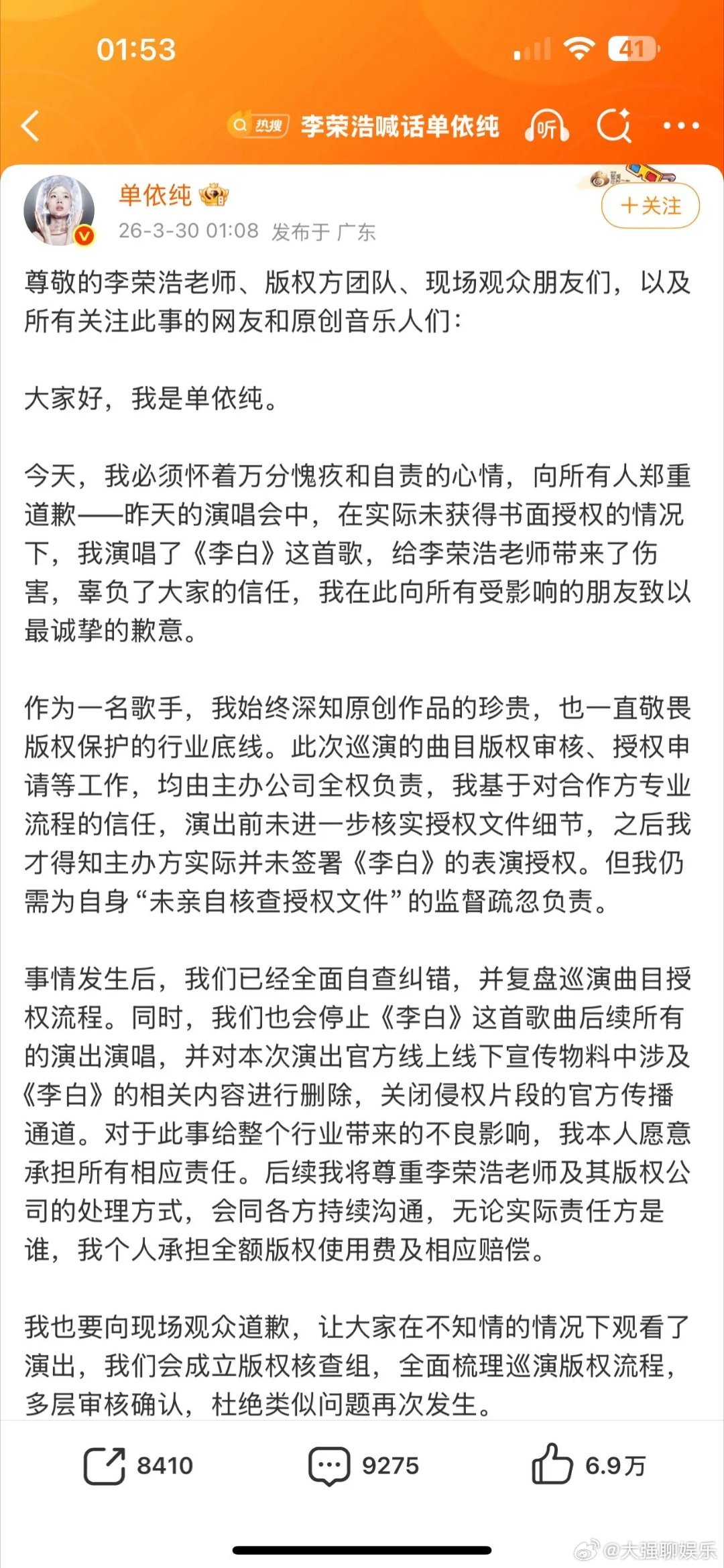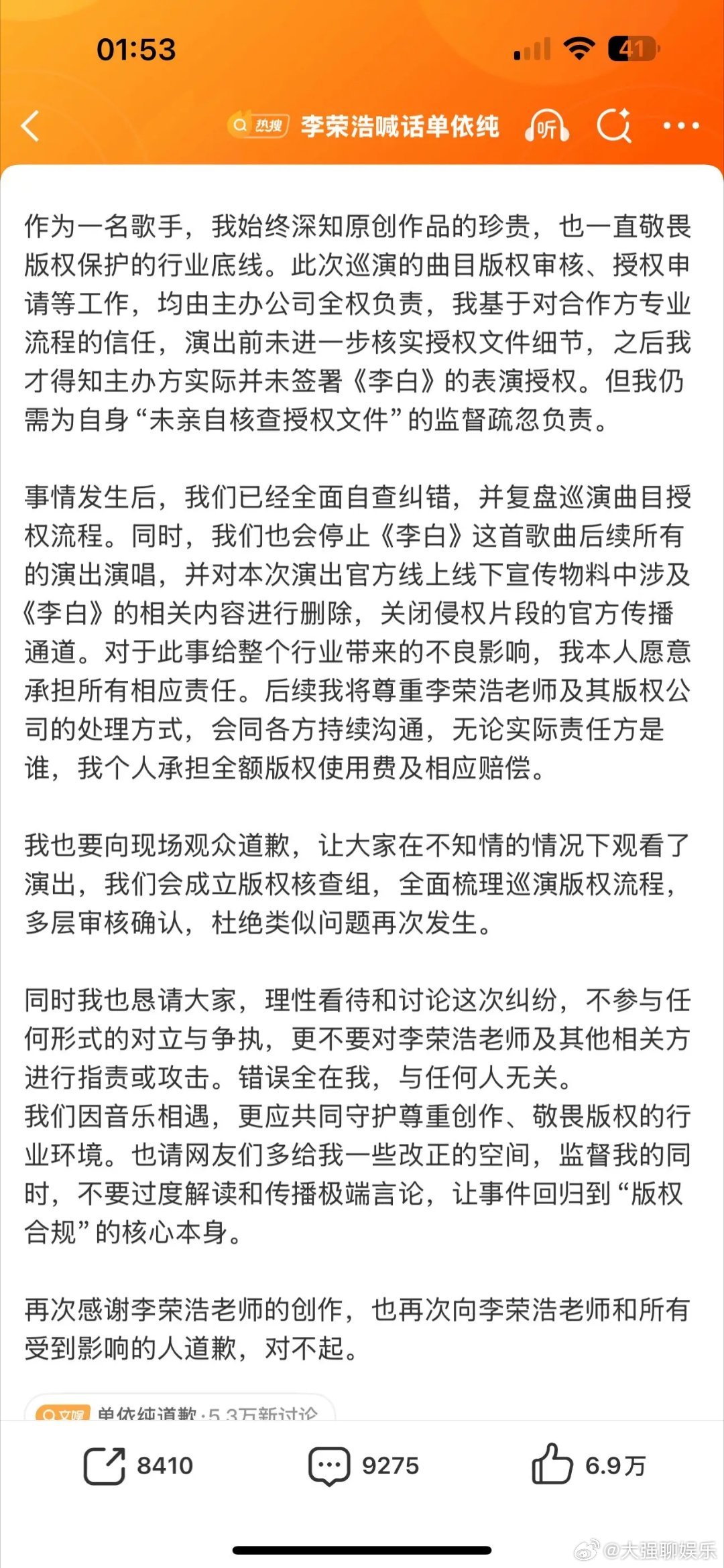 李荣浩说不需要赔偿既然两边都出来回应了,道歉、赔偿、后续安排也说得明明白白。版权的事按规矩处理就行,真没必要上升到人身攻击。粉丝都冷静点,别让自家偶像跟着背锅。