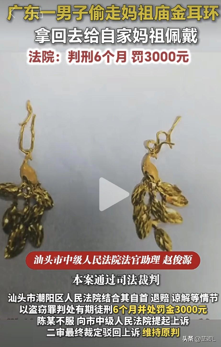 太荒唐了,怎么敢呢?!汕头男子偷妈祖金耳环,给自家神像戴,最终判刑又罚款! 天下之大,真是无奇不有! 汕头一男子的迷之操作,简直让人哭笑不得,最后还把自己送进了牢房! 近日,广东汕头,居民陈某出门逛街,路过一座妈祖庙,看到妈祖金身戴着一对金耳环,瞬间心生贪念,还冒出了个无比荒唐的念头。 他自己家里也供奉着妈祖神像,可家里的神像没有金耳环。他想的不是给自己家的神像供奉一个,而是直接盯上庙里妈祖的金耳环。 贼心一升,贼胆一壮,居然顺手就给偷回了家,转头就戴在了自家神像上。 按理说,自己家里供着妈祖、信仰妈祖,应该对神灵非常敬畏才对,陈某居然对妈祖金身的佩戴之物起了贪念! 陈某本以为这波操作神不知鬼不觉,却万万没想到法网恢恢疏而不漏,事情很快败露。 庙方报警了! 陈某事后虽然去自首了,家属也退赔了财物,还拿到了谅解,可偷东西这件事,那可是板上钉钉! 最后,法院以盗窃罪判处他有期徒刑6个月,罚金3000元。 没想到,陈某还不服气居然提起了上诉。但是法院也没惯着他,二审直接驳回,维持原判! 这下好了,耳环没戴成,自己反倒吃上牢饭,还得交罚款,简直是得不偿失,纯纯自作自受! 真是贪小便宜吃大亏,为了给自家神像配个耳环,把自己搞到坐牢,这脑子到底咋想的?简直是又荒唐又可笑! 为了一对金耳环,丢了脸面还蹲大牢,得不偿失。任何时候别碰违法的事,伸手必被抓,这教训太深刻! 素材来源:荔枝新闻,侵联删! 带定位晒今日生活 我的今日状态:💰期待暴富 我这里的天气:🌤️多云