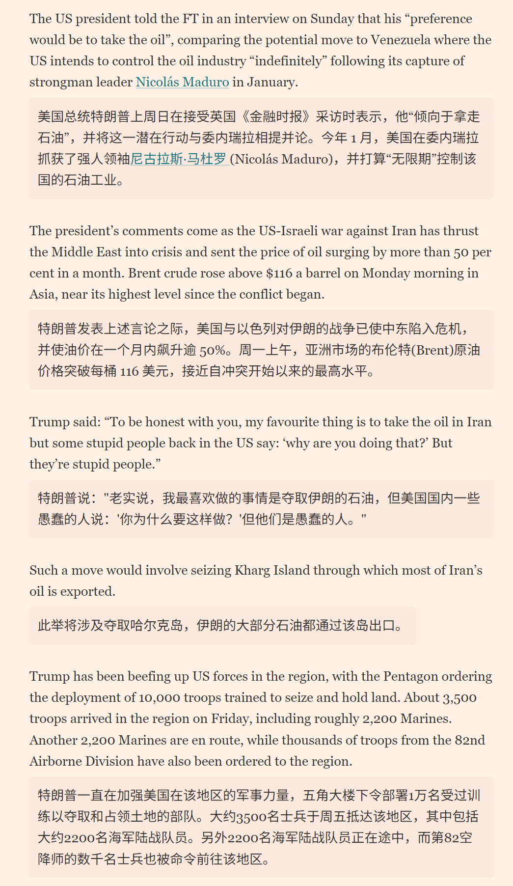 🔻特朗普告诉《金融时报》:“老实说,我最喜欢做的事情是夺取伊朗的石油,但美国国内一些愚蠢的人说:'你为什么要这样做?'但他们是愚蠢的人。”伊朗称美停战建议涉伊朗基本权利美特种部队数百人抵达中东海外新鲜事中东现场直击