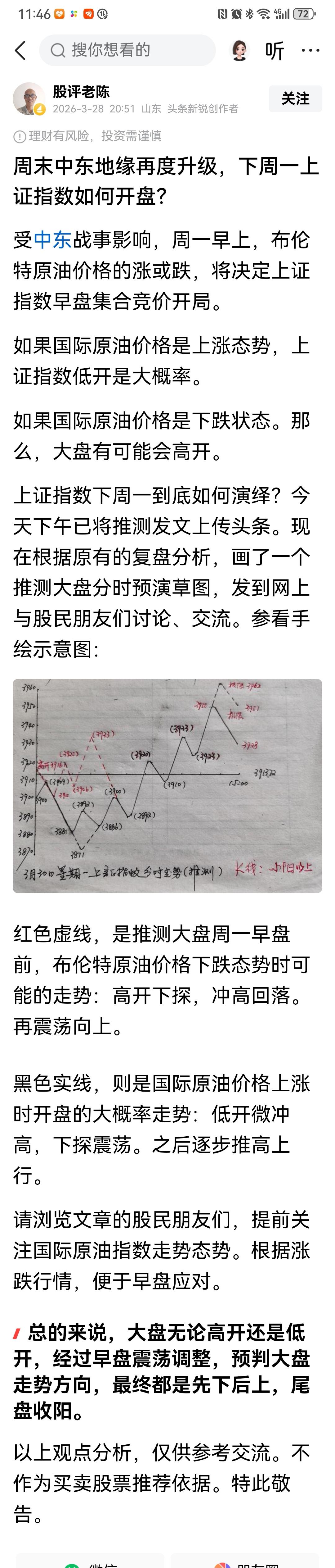 上周六连续发文两篇文字和分时草图各一篇。主要说明中东战事对大盘今天开市影响较大(即如何开盘?)和分时走势。没有浏览的股民朋友们可参阅下面其中一篇文章截图。 午间收盘,实盘情况是:大盘走势与预判方向基本上是大同小异;不相上下。符合推测预期。 简评几句上证指数今天走势: 上证指数上午较前几日成交量稍有放大。但是,早盘前半小时调整回撤时,恐慌盘、套牢盘、加上主力机构有意对倒砸盘,筹码消耗较大。无形为下一步走势留下不确定隐患。 为此,下午开盘,务必关注3912点。也是下午的风控点位。 如果下午开盘前半小时跌破3912点,指数不能被马上拉起来。我认为可根据个人风险偏好适量控制一下仓位。 如果前半小时没有出现跌破情况。总体上持股待涨。需要减仓,可参考预判分时草图高低点,高抛低吸。 总体上,继续维持昨天预判观点收阳。 以上观点分析,仅供参考交流。不作为买卖股票推荐依据。