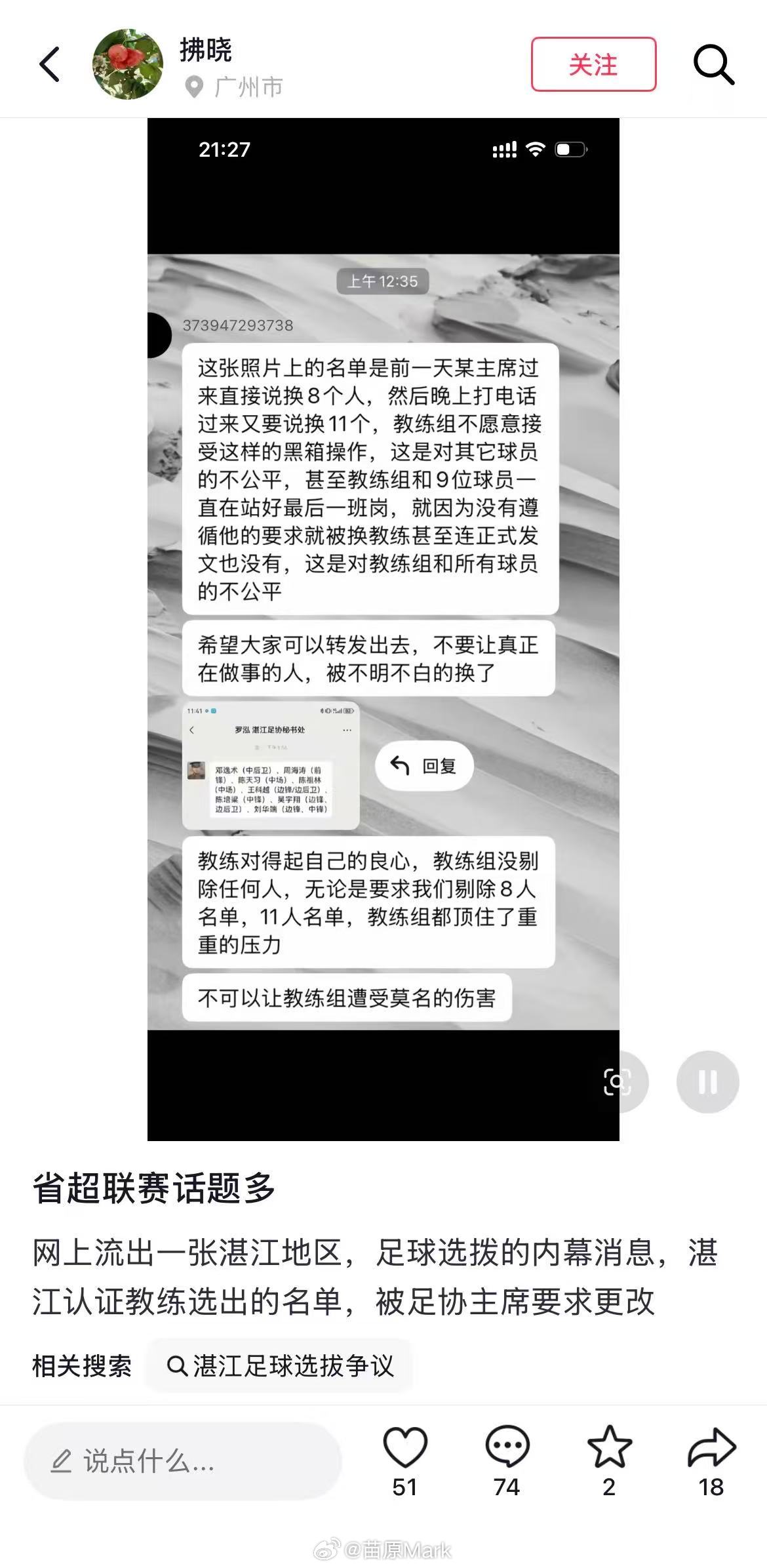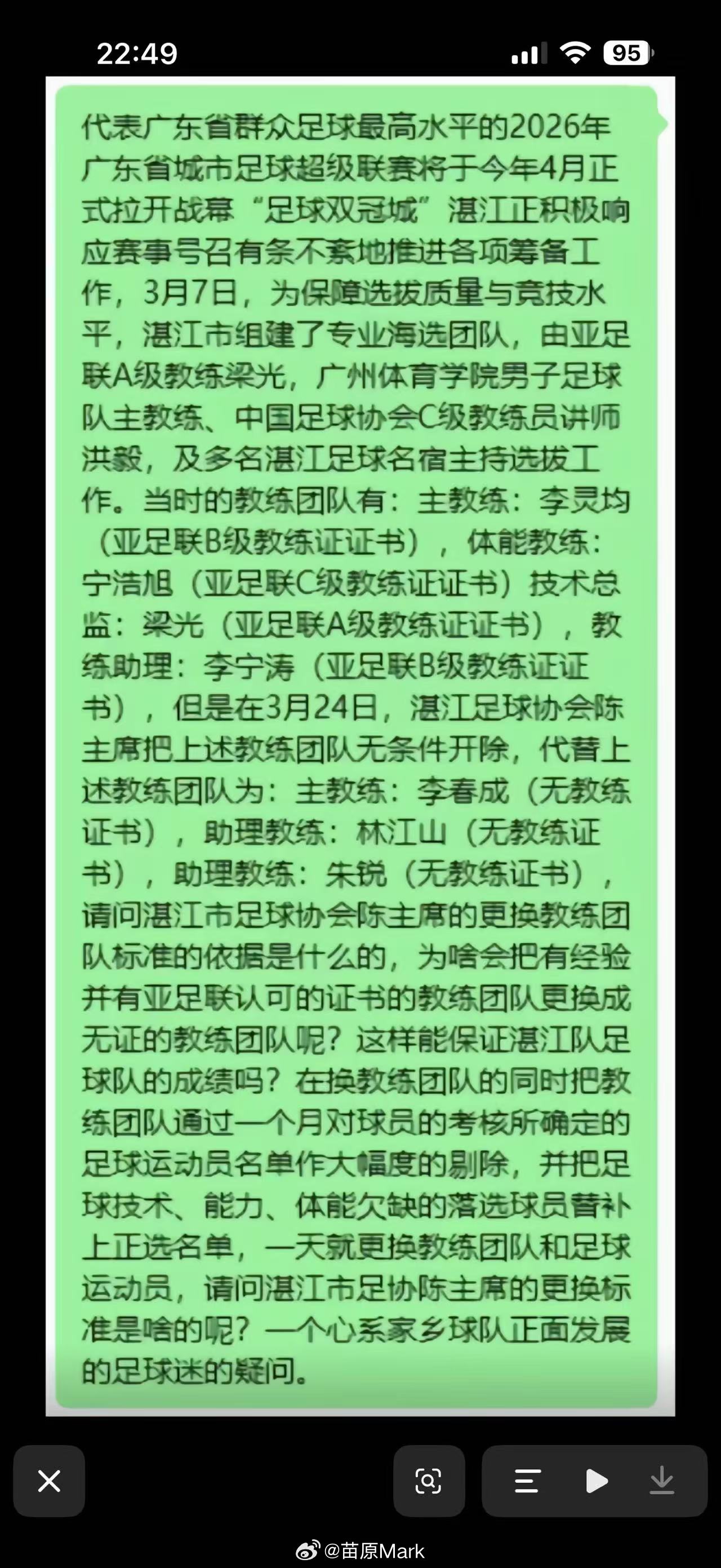 城市联赛搞起来,牵扯的利益越来越大,出现矛盾和争斗是迟早的,粤超湛江队就出了一遭球队教练组线上公开举报地方足协领导的事儿。