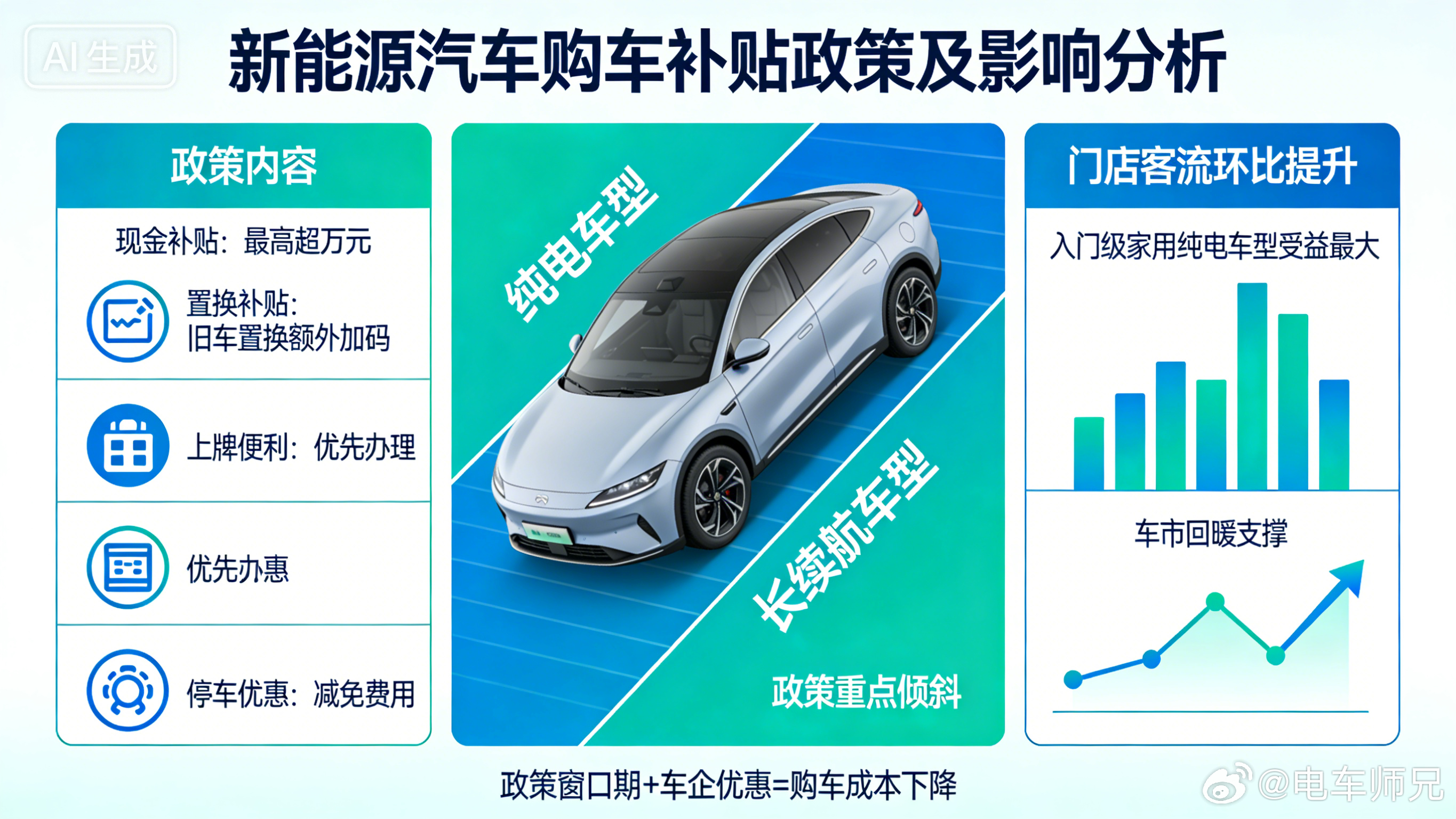 多地密集出台新能源汽车购车补贴,最高补贴超万元近期多个省市集中发布新一轮新能源购车支持政策,涵盖现金补贴、置换补贴、上牌便利、停车优惠等。政策重点向纯电车型、长续航车型倾斜,部分城市对旧车置换新能源车额外加码。补贴落地直接刺激终端销量,多家门店客流环比明显提升,入门级家用纯电车型成为最大受益品类。政策窗口期叠加车企优惠,消费者购车成本进一步下降,也为一季度车市回暖提供重要支撑。大V聊车