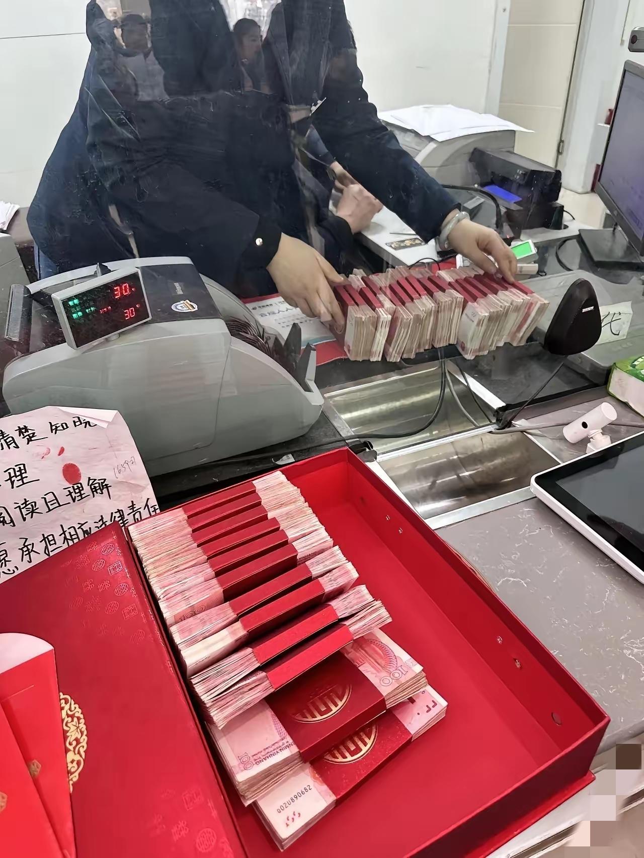 现在订婚彩礼也太折腾人了,30万现金先取出来撑场面, 仪式一完又赶紧存回去,纯属走个形式。 为了订婚当天看着体面,提前去银行预约取现,一沓沓现金摆出来确实够风光,可热闹过后,抱着巨款再跑银行存上,来回折腾不说,还担着安全风险。 要是取钱和存钱的不是同一个人,或是跨行办理,还容易多出不少麻烦。 其实婚姻里的真心和安稳,远比这一时的排场重要,没必要为了面子费这么大周折,简单实在反而更踏实。 婚俗越来越讲究形式,可真正过日子,还是简单舒心最重要。 你们当地订婚一般是多少彩礼,也会这样摆现金吗?