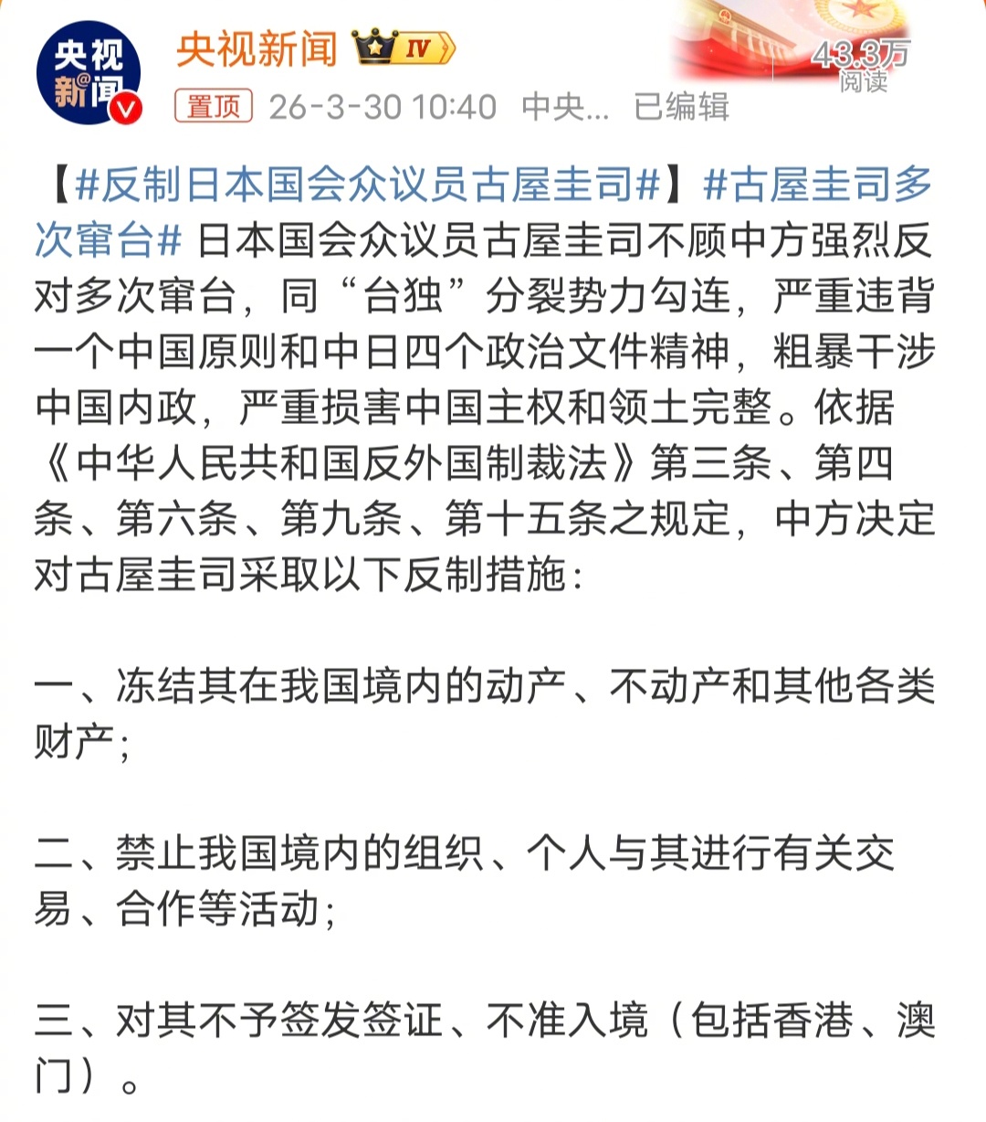 反制日本国会众议员古屋圭司