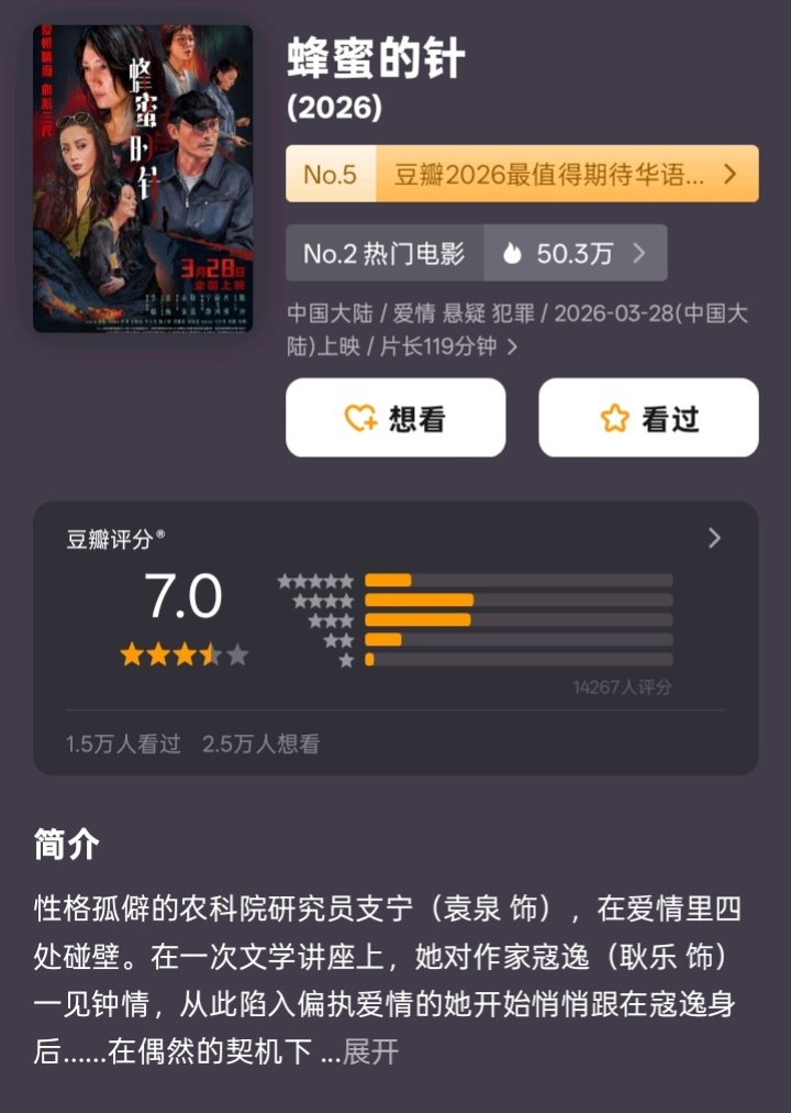 《蜂蜜的针》豆瓣开分7.0,比导演前作高出0.5分。说实话,原版应该能上7.3-7.5分左右。毕竟这个7分,是在经历了不断删改、AI换脸、补拍、压了十年后的结果。