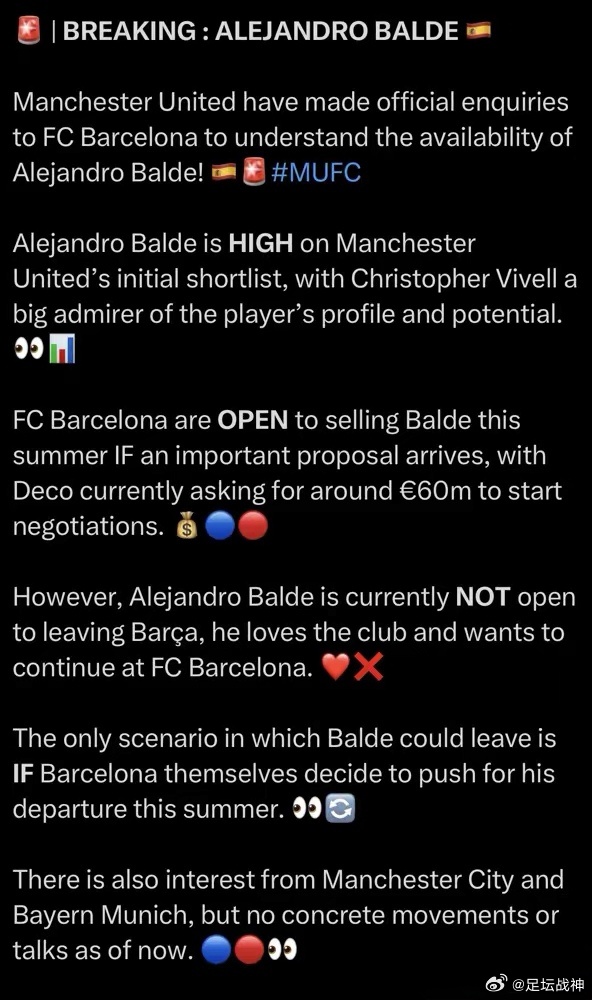 生活手记巴萨左后卫巴尔德,年薪167万欧元。解约金10亿,标价却只要6000万。曼联、曼城、拜仁都来问价,但20岁的他只想留在诺坎普。他是拉玛西亚的孩子,周薪约3.2万欧,在队内是“最低薪”主力之一。右后卫孔德和坎塞洛的工资,是他和另一名左后卫总和的8倍。巴萨最近松口了,说他“不再不可触碰”。因为他是自家青训,卖他6000万,几乎全是“纯利润”,能极大缓解FFP(财政公平法案)压力,腾出钱去买中锋和中卫。一个热爱俱乐部的孩子,成了账本上最诱人的资产。有时候,最纯粹的热爱,在生意场上反而最容易被估价。