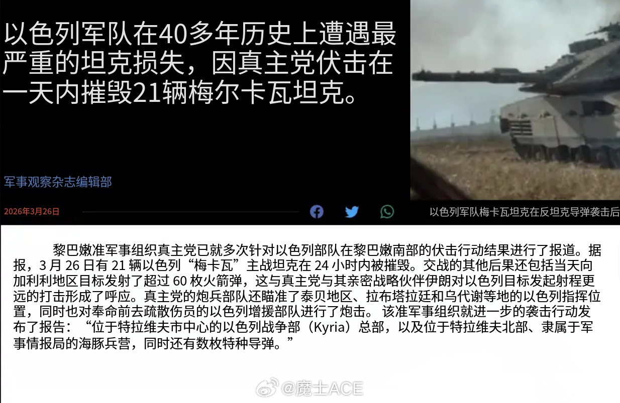 以色列方面再爆超级喜讯——用21辆梅卡瓦坦克,成功销毁珍珠党战士的炸弹!以色列近期打不动伊朗,再度回头去打黎巴嫩的珍珠党。口气喊的震天——说是要全面攻占利塔尼河以南。然后,以色列的可乐兵,一头扎进了黎巴嫩南部的山区里。结果怎么着?泰贝赫的法卡尼地区的崇山峻岭里,以色列的梅卡瓦坦克摆出了一字长蛇阵,在蜿蜒的山路上挺进。然后,就是喜闻乐见的环节——珍珠党把以色列的坦克堵在山谷里炸,击首而尾不能至,击尾而首不能至!一场仗打下来,21辆梅卡瓦报销!乖乖哦,21辆坦克,这相当于以军第36装甲师第7旅的一个装甲营核心战力被彻底销户了。果然就是,你不打,你不知道那些吹上天的钢炮有多菜!以色列自己都在喊——悲报,装甲部队40年来最大的损失!美伊以冲突烽火问鼎计划特朗普当众羞辱沙特王储