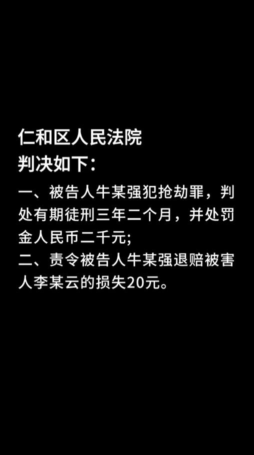 “一分钱也不行!”2025年3月,四川攀枝花,一男子因家庭纠纷无法回家,身上也没什么钱,就在路边物色目标,实施抢劫。被害人路过他跟前时,他突然动手,用胳膊勒住被害人的脖子,将其拖走,抢走了被害人身上的20元钱。法院:有期徒刑三年二个月! 据报道,牛某自己患有精神病,事发当天,因为家庭冲突被赶出了家门,他身上也没有钱,就动了抢劫的心思,蹲在人行横道旁的一块大石头上,物色着目标。 当晚11点左右,被害人在他跟前路过。牛某突然间出手,用小臂将她脖子勒住,从小路上把她拖进了一个小公园。牛某一边控制住被害人,一边上手翻她的挎包。被害人担心自己受伤,便将包里的20块钱给了他。 这时候,被害人看见旁边有人经过,便大声呼救,同时挣脱了牛某得控制,逃脱后迅速报了警。很快,警方就将牛某抓获。牛某承认了自己的犯罪事实,但狡辩称自己当时精神病发作,而且就抢了20块,申请减轻处罚。 法院进行了司法鉴定,认定当时牛某具有完全刑事责任能力。审理之后,法院做出了判决:判处有期徒刑三年二个月,并处罚金人民币二千元。 网友看后表示,抢劫罪看的不是抢了多少,精神病更不是挡箭牌,犯了罪就要接受法律的制裁!若是当时他使用了刀具等胁迫,判罚一定会更加严重! 信息来源:《第7集:悔不当初!男子当街抢劫20元,换来3年刑期+罚款!