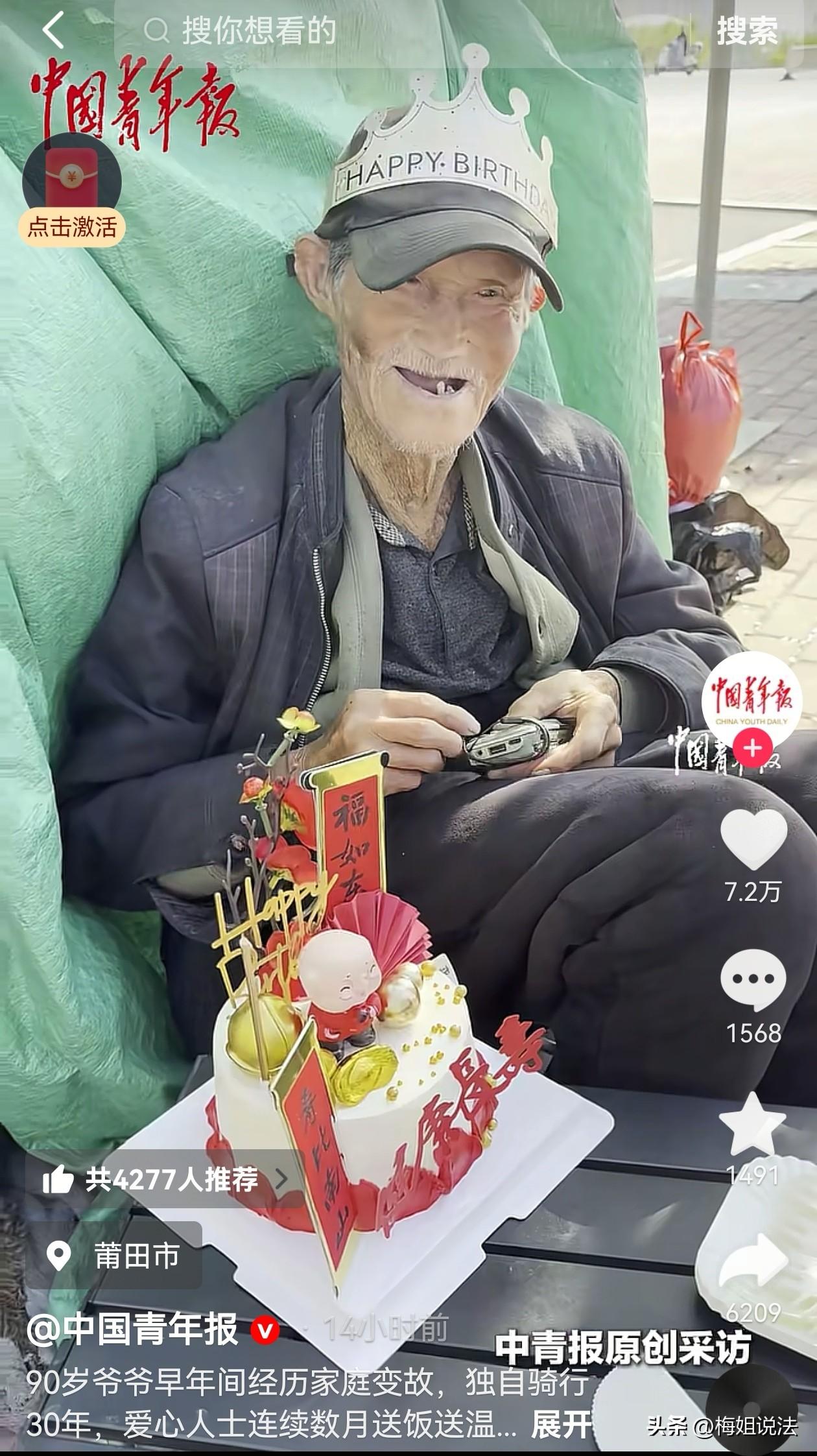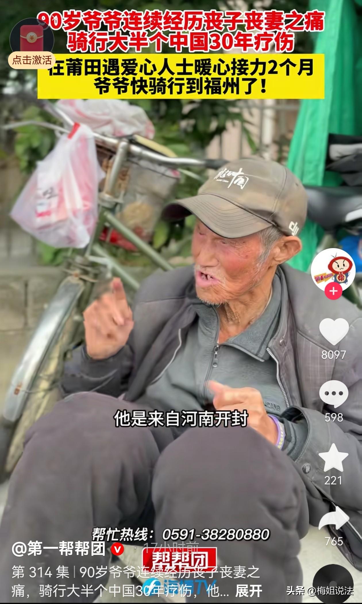 河南开封,一位老爷爷的儿子、儿媳、孙子三人在一场车祸中都离开了。老伴每天都哭,哭瞎了双眼,在儿子一家离世一年后,老伴由于伤心过度也离开了。爷爷当时有些精神失常,自己到处乱走开始流浪生活,后来发现走出去精神状态反而好了起来,于是爷爷开始了全国骑行疗伤。 张爷爷今年90岁了,他开始骑行已经有30个年头。 张爷爷有一个儿子,到了适婚的年纪,儿子就结婚生子,每一步都按部就班的走,爷爷和老伴一点都没操心,日子过的相当惬意。 儿子儿媳也孝顺,逢年过节大包小包的往回买东西,他们很舍得为父母花钱。平时也经常回来探望。 张爷爷总告诉儿子,人回来就行,不要乱花钱,有钱你们攒着,你们小家日后用钱的地方多着呢! 不管爷爷说什么,儿子总是应着,但回来还是买很多东西。 爷爷虽然嘴上抱怨,但心里其实别提有多美了! 但30年前的一次回家路上,儿子一家不幸发生了车祸,儿子、儿媳,还有孙子都在这场车祸里丢了性命。 张爷爷赶到时,他们一家三口就静静的躺在那里,被布遮着。 去往现场的路上,张爷爷还念叨着一定不是我儿子。 可到了现场,虽然被撞的有点面目全非,但张爷爷还是一眼就看出了,那就是儿子一家。 这时候的张爷爷已是欲哭无泪。白发人送黑发人的痛苦不亲身经历怎么能懂! 老伴知道后,天天哭,吃不下,睡不好,身体消瘦了很多。由于伤心过度,老伴也在第二年离开了。 张爷爷自己也精神恍惚,家里也没有什么人了!一个人,哪还有家,走到哪哪就是家,张爷爷想。 于是张爷爷迷迷糊糊地离开了家,走出去好像也找不回来了,就算找的回来,他也不会想回。就这样,他慢慢开始了流浪地生活。 流浪了一段时间,他在外边好像暂时忘记了家人离开的痛,渐渐的,他发觉自己的状态变好了。 张爷爷想,好了也不回家了,回到家就能想起那些伤心事,保不准自己还会再次陷进去。 于是张爷爷就继续开始在外飘荡的生活,他觉得在外边看看风景挺好,既治愈了心情,又忘记了烦恼。 张爷爷骑着他的三轮车出走,这一骑就骑了30年,走遍了很多省份。这30年里,有过很多好心人帮助他。 两月前,张爷爷骑行到了福建莆田。有好心人想帮他租房,让他安度晚年。张爷爷拒绝了。他说这是他选择的活法,不是乞讨。 虽然爷爷拒绝了,但有位好心的姐姐天天给爷爷送餐,还给爷爷过了一个生日,还陪爷爷一起过了年。 这个姐姐还给张爷爷买了一个老人机,留了电话,想着以后也可以随时联系到他。 还有人通过这位姐姐给爷爷捐了款。这位姐姐都给爷爷攒着,见面都给了爷爷。 张爷爷也通过这位姐姐的镜头感谢了广大网友! 本来爷爷还想从福建骑到浙江,去寻找老友,但3月29日,好心姐姐联系到张爷爷时,说爷爷计划有变,他想骑往福州,然后回到老家河南。 好心姐姐呼吁福州的小伙伴能够爱心接力继续帮助爷爷! 根据《老年人权益保障法》和现行政策,同时具备以下条件的90岁无子女老人,可申请特困人员救助供养: 申请条件(需同时满足): 一、无劳动能力(60周岁以上自动认定) 二、无生活来源 三、无法定赡养、抚养、扶养义务人,或其义务人无履行义务能力 《社会救助暂行办法》第十四条:对无劳动能力、无生活来源且无法定赡养、抚养、扶养义务人,或者其法定赡养、抚养、扶养义务人无赡养、抚养、扶养能力的老年人、残疾人以及未满16周岁的未成年人,给予特困人员供养。 第十五条:特困人员供养的内容包括: (一)提供基本生活条件; (二)对生活不能自理的给予照料; (三)提供疾病治疗; (四)办理丧葬事宜。 法律对特殊人群的老年人有着特别的关照,根据以上法律爷爷本可以得到救助供养,安享晚年。 但他不给祖国添麻烦,靠着自己的一腔热血,走了很多地方!也把乐观和笑容带到了各个地方! 张爷爷的故事很励志,年纪那么大,经历了那么多的悲伤,依然努力前行,不卖惨,不求人。 张爷爷的笑容很灿烂,希望他可以一直这么乐观下去,有个快乐的晚年。 大家对张爷爷的故事怎么看?欢迎评论留言。