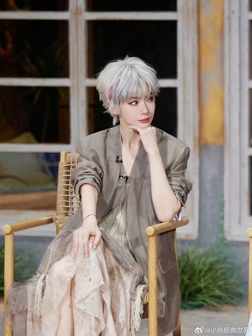 戚薇白发造型美我一大跳戚薇白色短发造型第一眼看到戚薇白发短发造型真的反应不过来,新颖又别致的设计凸显个人风格,西装拼接纱裙的搭配,尽显别样的时尚高级感