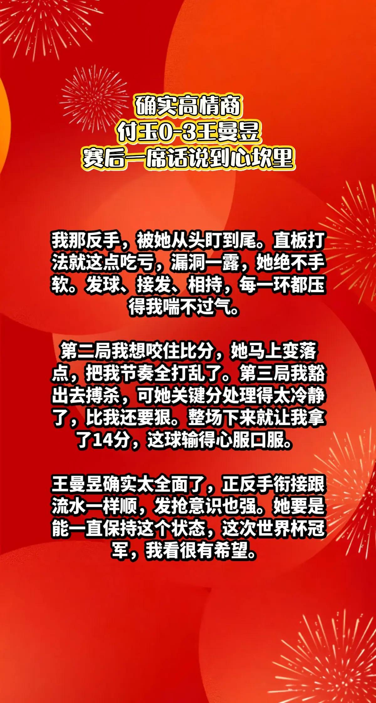 王曼昱3-0付玉,赛后我看清了3件事。王曼昱 澳门世界杯