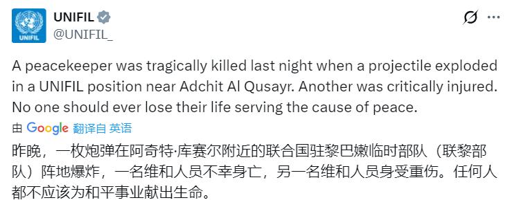 以色列再次杀害维和部队人员[发怒][发怒][发怒][发怒] 据媒体消息:周日,以色列IDF炮兵袭击了位于黎巴嫩南部的联合国维和部队基地。 据联黎部队表示,一名维和人员不幸身亡,另一名维和人员身受重伤。 联合国秘书长古特雷斯:我向殉职维和人员的家人、朋友和同事以及印度尼西亚致以最深切的慰问。祝愿受伤的维和人员早日康复。 补充: 2024年10月,以色列国防军袭击黎巴嫩南部三处联黎部队营地,包括意大利营和斯里兰卡营,造成多名维和人员受伤。 2025年11月,以军坦克向联黎部队徒步巡逻队开火,炮弹落在距离维和人员仅5米处,以军解释为“天气条件导致的误认”。 2026年3月6日,以军坦克炮击联黎部队加纳营总部,造成3名加纳籍维和人员受伤,营地设施严重损毁。 2026年3月29日,最新致命袭击发生,联黎部队遭炮击,导致1死1重伤。
