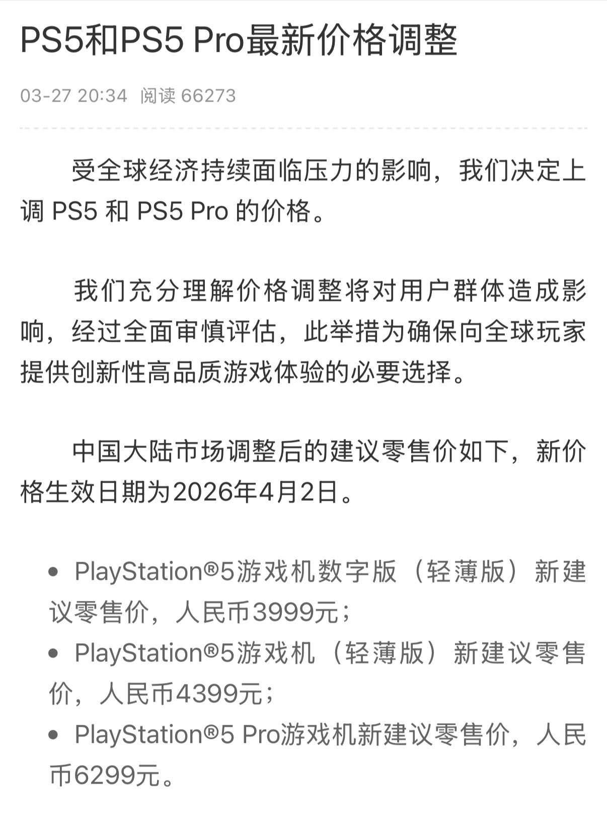 储存涨价的风还是吹到了游戏主机头上索尼官宣 4 月2 日起上调 PS5 Slim 和 PS5 Pro 的价格。