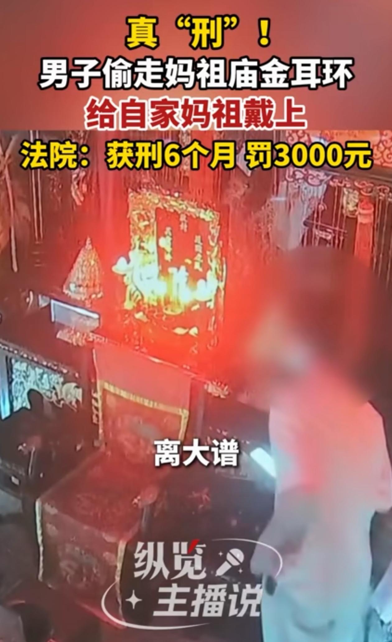真是个人才!广东汕头,男子偷走妈祖像上的金耳环,被抓后还不服气,辩解称自己不是为了卖钱,只是想拿回家给自家妈祖戴上! 据男子自己解释,当时他路过妈祖庙,发现庙里的妈祖像带着金耳环,觉得这样还挺好看的。 要是换成别人,可能顶多也就是欣赏。但这个男子的脑回路异于常人,他想到自己家里也有一尊妈祖像,但却没有合适的首饰来打扮,于是他灵机一动,直接把人家庙里这位的金耳环摘了下来,带回家后给自家妈祖带上了! 结果他的所作所为都被庙里的监控拍了下来,很快他就因为偷东西被抓了。 虽然男子承认了自己的错误,但他还是不服气,他觉得自己拿这个又不是为了卖钱,大不了再还回去就好了,有必要非得处罚自己吗? 但法律就是法律,哪怕是作为私用,偷东西也是不行的。因此男子最终还是因为盗窃,被判了6个月,并罚款3000。 对于这件事,有网友看了之后感叹这下他在汕头应该是混不下去了,还有网友惊讶,没想到汕头的妈祖竟然戴得是真金白银。 这男子的行为确实让人哭笑不得,你说他信妈祖,却敢去偷人家东西。你说他不信,他偷这个又是为了给自家的戴。 虽说都是给妈祖戴,但偷东西就是偷东西,不管什么理由都不能成为辩解,只希望这位男子能长点心,以后别再做这种糊涂事了!