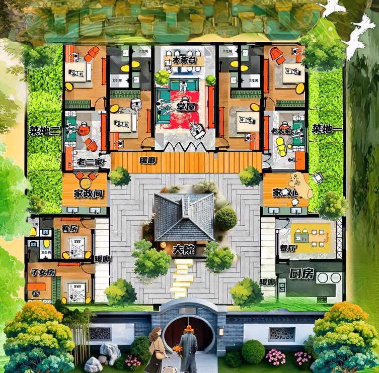 556㎡长的太草率了 ,在薄薄的一层纸,邂逅两块42㎡菜地,简直称得上绝顶自建房! 虽没有几个城里人能受了,绿油油乃是中登后无可替代,解决寂寞最有效的手段! 大合院,布局太简陋,却有乡村烟火气息! 如果不讲究,它分三大块,其一,菜地和厨房是臭味相结合,属性忙碌区!隐藏功能是家政区,算不算最急功近利的露天洗衣房! 其二就,是叠加三套房,虽都是小户型,却像换户型不换布局的出租房,最出彩是带堂屋的两居室,真的适合村里人的生活方式! 其三看一进院,你说它是简版的合院,符合条件。说它三进式,也不错,它有两个大号侧院,以天井的形式给自建房赋能的! 一半讲合院精气神,韵味浓! 另一半是生活大道理,如果你喜欢种菜摘豆,生活不娇情,它绝对是大家簇的贤内助,能旺三代人。 最能考验,生活有情怀的男人和女人!