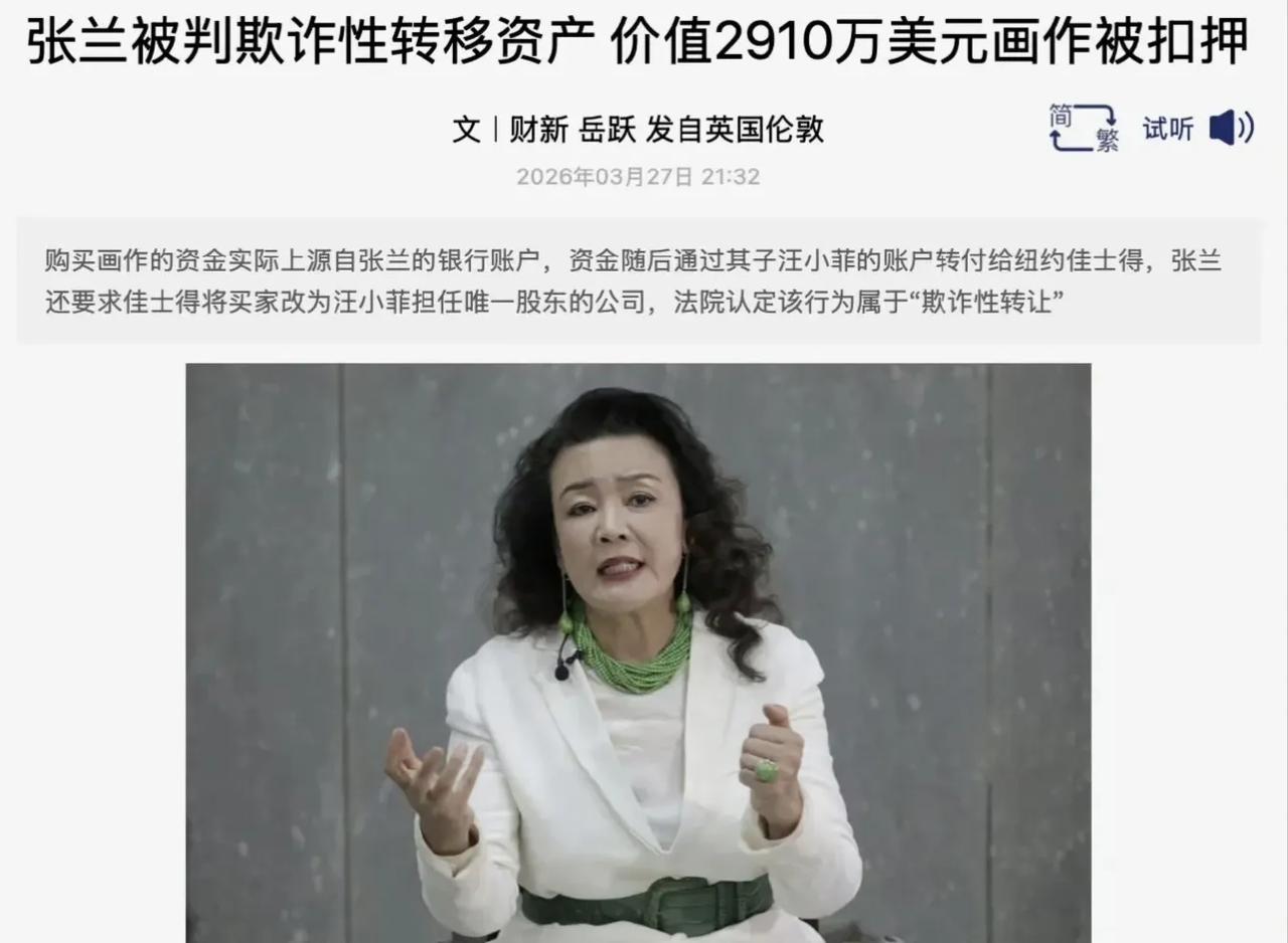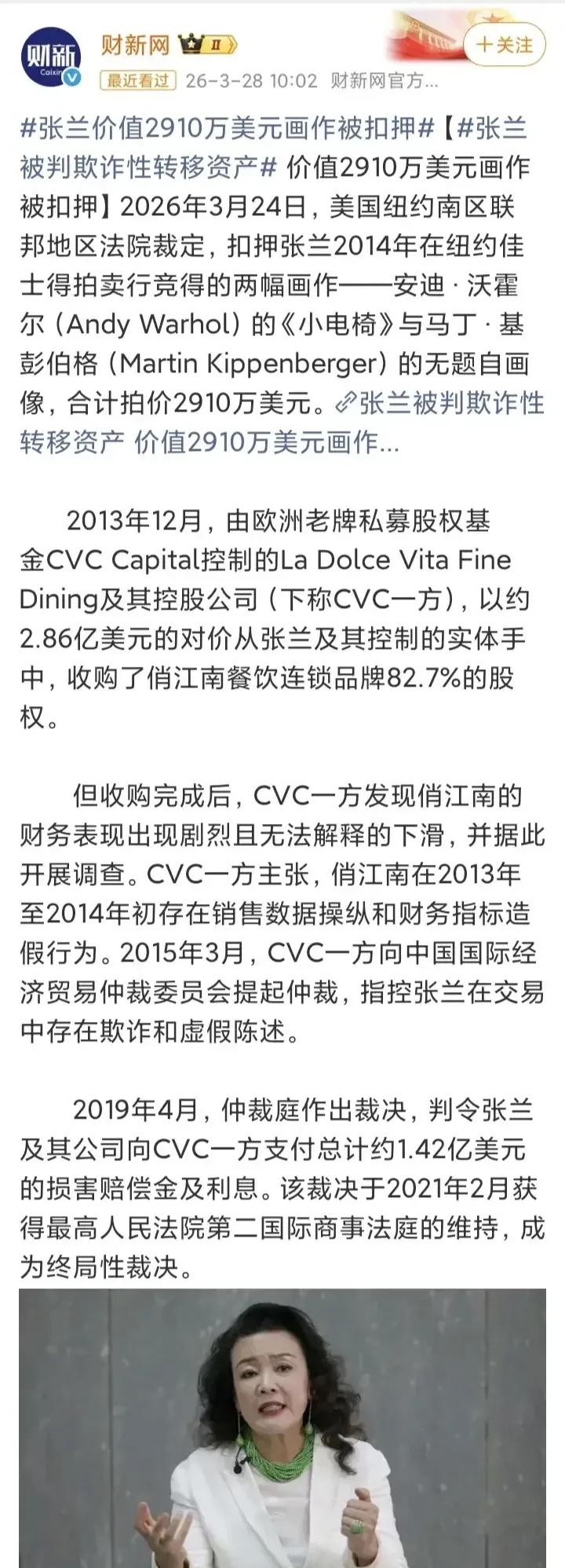 俏江南张兰被曝隐藏2910万美元资产 张兰和CVC的这出“资本连续剧”,最近又有了新番。美国纽约南区联邦法院在3月24日裁定,扣押她名下两幅总价约2910万美元(约合人民币2亿元)的名画,理由是涉嫌“欺诈性转移资产”。 这两幅画(安迪·沃霍尔的《小电椅》和马丁·基彭伯格的自画像)是2014年在佳士得拍的。法院查实的操作路径很清晰:钱是从张兰账上出的,但经汪小菲账户转给拍卖行,最后登记买家却是汪小菲的公司。法官认为,这是在债务纠纷升级期,故意把资产挪出自己名下,性质属于欺诈性转让。 这已经不是张兰海外资产第一次被“击穿”了。之前新加坡的家族信托也被接管,加上这次的名画,CVC正在一步步把裁决书上的数字变成实际收回的现金。 一边是法院认定的“隐匿资产”,一边是张兰在直播间反复强调的“没房没资产、钱都烧在生意上”,两边的说法确实存在温差。这场横跨多年的债务拉锯战,看来离最终清算又近了一步。