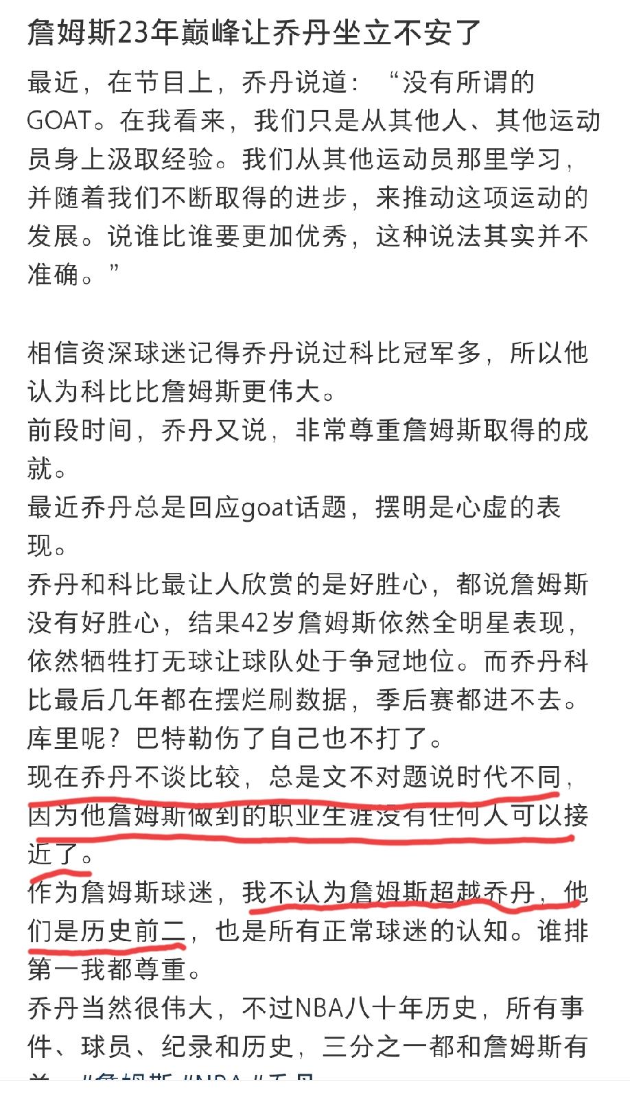 乔丹现在有点坐立不安,因为詹姆斯23年巅峰职业生涯严重威胁到了他nba史上GOAT的地位?有网友如是说!!! 这位网友给出的理由是:近段时间乔丹会时不时的回应goat这个话题,这不像他以前的风格! 他还说了,他不认为詹姆斯超越了乔丹,他们是历史前二。至于谁第一、谁第二,他没有明说,但话里话外不认可“乔丹是goat”的这个观点。 可事实真的如此吗?相信100个球迷里面有90个是认乔丹而不认詹姆斯的吧?