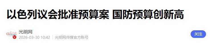 62:55!以色列又创下一个历史,就问特朗普怕不怕? 特朗普现在是真的想停战了!当地时间3月29日,也就是数小时前,他明确表示:“停战协议或很快就能达成!”然而,偏偏在这个节骨眼上,以色列传来一个重磅消息。 当地时间3月29日,也就是数小时前,美国总统特朗普在从佛罗里达飞往华盛顿的空军一号上, 根据以色列官媒和新华社、央广网等权威媒体的最新报道,以色列议会在3月30日进行了一场关键投票,议题就是2026年国家预算案。 最终投票结果出炉,62票同意,55票反对,预算案顺利通过,这不仅避免了以色列政府垮台和提前大选,更创下了一个以色列的历史纪录——这份预算案是以色列史上规模最大的预算案,总支出达到8506亿新谢克尔,约合2710亿美元,而其中最引人关注的,就是国防预算,直接创下了历史新高。 单单是国防部的预算,就超过1420亿新谢克尔,换算成美元大概是453亿,这可是以色列有史以来最高的国防预算,比2025年的300亿美元左右的国防预算,增长了足足一百多亿美元。 可能有人会问,以色列这时候为啥要搞这么高的国防预算?其实看看当下的局势就很清楚了,现在以色列正深陷多线作战的泥潭,根本没有停火的打算。 一方面,以色列在加沙地带的军事行动虽然有过短暂停火,但冲突一直没真正停止,停火后仍有不少加沙民众伤亡,人道物资准入也被频繁限制;另一方面,以色列还在约旦河西岸不断推进定居点扩建,甚至计划吞并约82%的约旦河西岸土地,过去一年里,已经有3.6万名巴勒斯坦人被迫流离失所。 除此之外,以色列还在黎巴嫩方向推进“缓冲区”计划,打算把控制范围扩展到利塔尼河,相当于黎巴嫩近十分之一的国土,同时还和美国一起,对伊朗发动了大规模军事打击,目标包括伊朗的军事设施、能源基础设施和高层人物。 这么多的军事行动,自然需要大量的资金支持,这也是以色列大幅增加国防预算的核心原因。按照以色列议会的公告,这次增加的国防预算,很大一部分是考虑到“咆哮的狮子”行动,要用于军事装备采购、军队训练、后备役士兵支持,以及战争受影响地区的重建等。 而且从以色列国内政治来看,今年10月就要举行议会选举,内塔尼亚胡政府一直靠强硬的安全政策凝聚国内共识,这次大幅提高国防预算,也是为了迎合国内的安全诉求,巩固自己的执政基础。 不过从投票结果也能看出来,以色列国内对此也有不小的分歧,55票反对的声音,大多是担心巨额国防预算会挤压民生领域的开支,毕竟在持续的战争状态下,以色列的经济也面临不小的压力。 再回头看特朗普,他现在是真的想推动停战,除了巴以局势的压力,还有他自身的战略考量。近期特朗普在美洲之盾峰会上就通报了美以与伊朗战争的进展,而且他一直试图统筹地区力量,推动自己的地区战略,巴以停火其实也是他地区战略的一部分。 可以色列这次的举动,明摆着就是不配合特朗普的停战诉求,甚至可以说是唱反调——你要停火,我就加大国防投入,继续强化军事力量,摆明了要把当前的军事行动持续下去。 其实这也不是以色列第一次不配合美国的诉求了,虽然美以是盟友,但在巴以问题上,双方的核心诉求一直有分歧。 特朗普想通过停火稳定中东局势,抽身去推进自己的其他战略,而以色列则一心想通过军事行动,扩大自己的战略纵深,削弱周边的对手,比如伊朗、黎巴嫩真主党,还有巴勒斯坦的相关力量,实现自己的安全目标。 尤其是在国际社会压力越来越大的情况下,中国在联合国明确支持巴勒斯坦独立建国,192个联合国会员国都接到了相关通知,欧盟也开始谴责以色列的单边行动,甚至准备实施制裁,南非还把以色列告上了国际法院,指控其种族灭绝,在这种情况下,以色列非但没有收敛,反而加大国防投入,就是想表明自己的强硬立场,不想被外部压力左右。 很多人都在问,特朗普看到以色列这波操作,到底怕不怕?其实与其说怕,不如说特朗普的停战计划被彻底打乱了。 特朗普本来以为自己放出停火信号,以色列作为盟友会积极配合,毕竟美国一直是以色列最坚实的后盾,可没想到以色列直接用行动打了他的脸。 453亿美金的国防预算,不是一笔小数目,这意味着以色列接下来会持续加大军事投入,多线作战的态势不会改变,巴以停火自然也就无从谈起,特朗普之前承诺的“很快达成停战协议”,大概率会沦为一句空话。