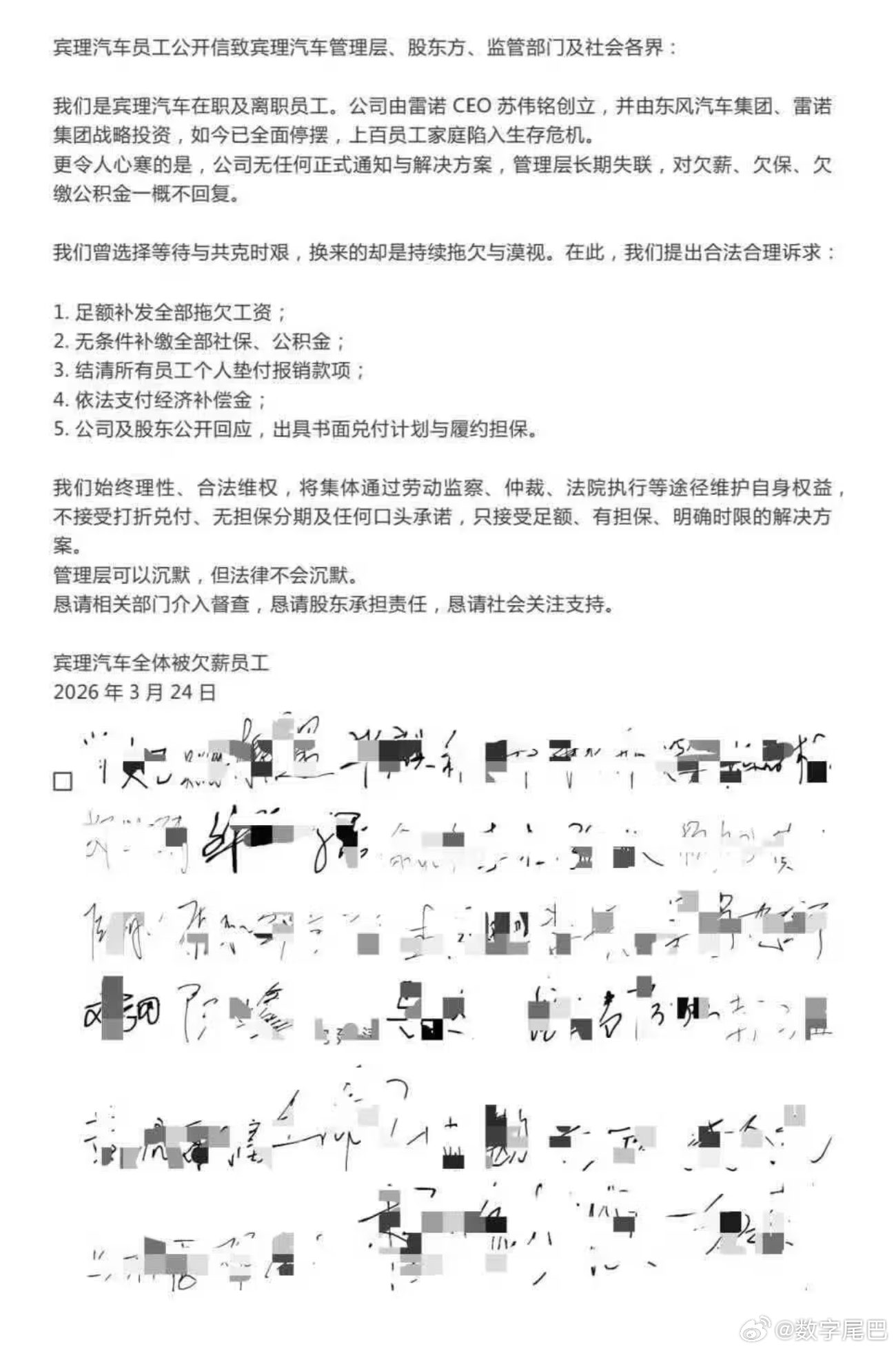 此前,宾理汽车内部通知中曾以经营情况及现金流状况为由,向员工提出协商解除劳动合同方案,承诺给予 N 倍经济补偿金,未明确补偿金、欠薪及社保的具体兑付时间。但,公司无任何正式通知与解决方案,管理层长期失联,对欠薪、欠保、欠缴公积金一概不回复。