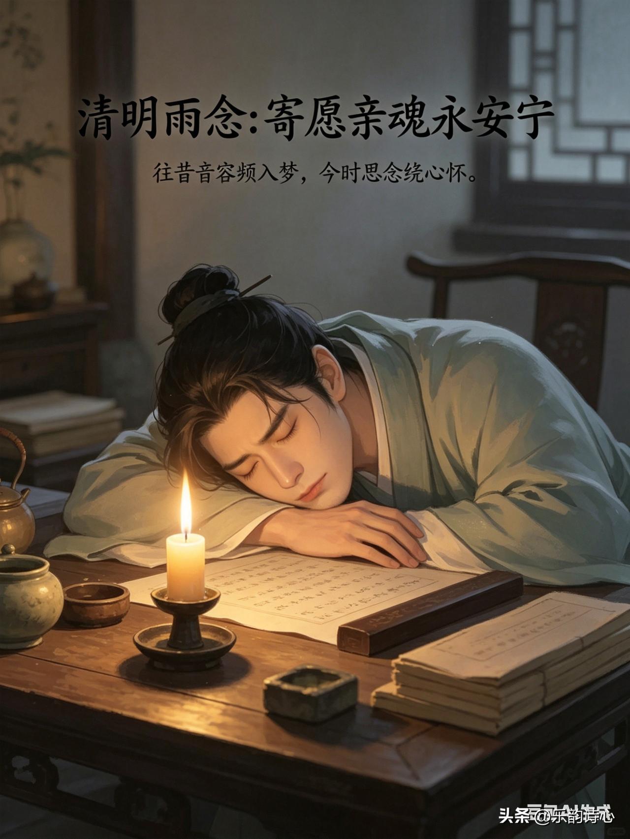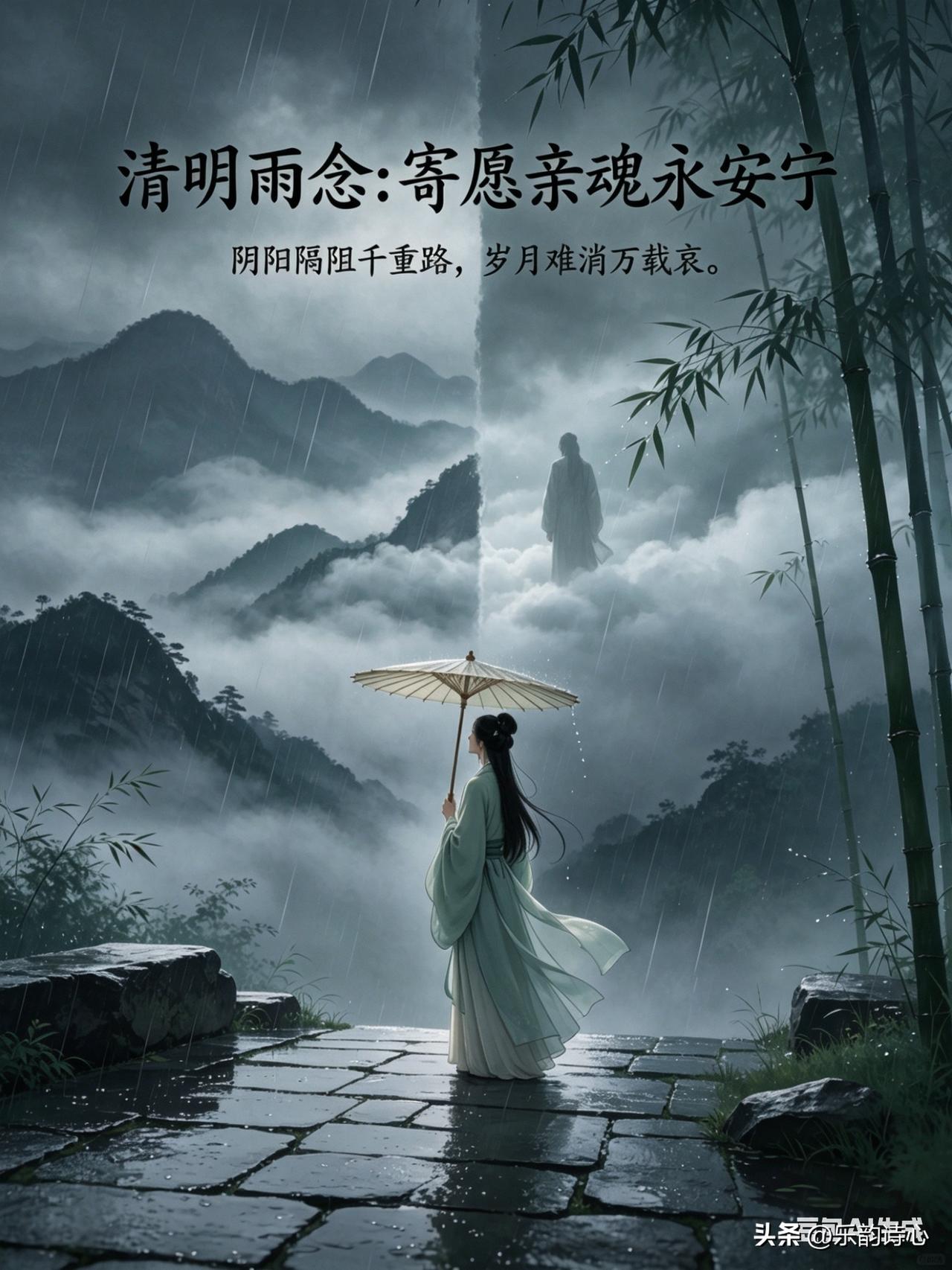《清明雨念:寄愿亲魂永安宁》乐韵诗心原创诗词: 清明细雨润尘埃, 遥望云间泪满腮。 往昔音容频入梦, 今时思念绕心怀。 阴阳隔阻千重路, 岁月难消万载哀。 焚纸寄情风送远, 唯祈亲魄永安哉。 此诗以清明细雨起笔,营造出哀伤氛围。遥望云间,泪水满腮,尽显对天堂亲人的思念。往昔音容常入梦,更添眷恋。阴阳相隔,路途遥远,岁月也无法消解哀伤。最后通过焚纸寄情,借清风将心愿送达,只盼亲人魂魄永远安宁,情感真挚深沉。