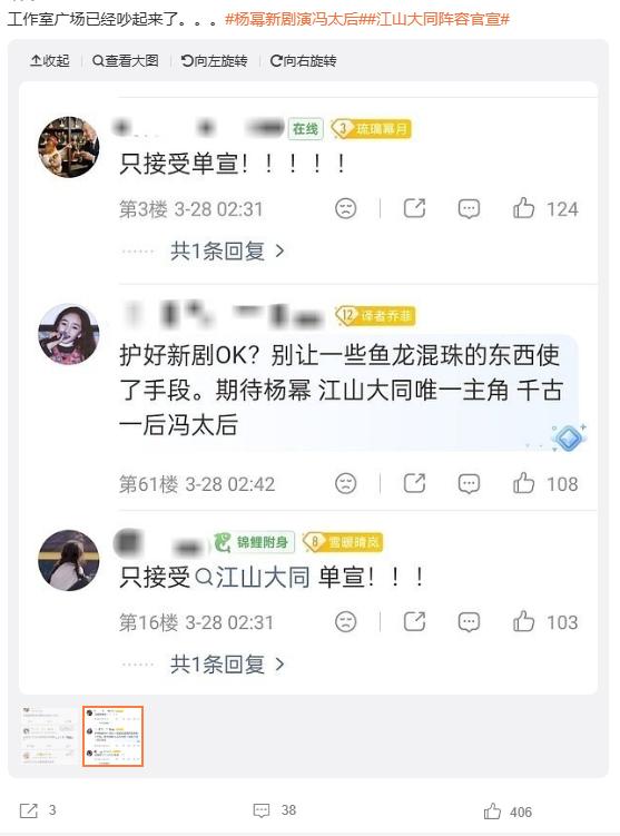 杨幂进组历史正剧,演冯太后一生,评论区嘲声一片:“浪费3亿!” 《生万物》去年是播得不错,但杨幂本人的演技还是备受诟病的。 但她的资源显然是很不错,连历史正剧都演上了! 这次是耗资3亿不说,还要分饰两角,更是要演出从15岁演到49岁的巨大人物跨度。 大家对杨幂的演技和气场是担心不已。 之前演农村妇女,自毁形象还能演出一些相似感。 但这演气场满满的太后,可不是装一装就能演好的。 大家很担心,她演不出角色身上的厚重历史感。 而且从杨幂进组的服装来看,黑西装+白色纱裙,感觉走得还是少女感那一套。 观众在这里担心杨幂的演技问题,粉丝却只关心姐姐的番位。 虽然官宣没多久,但她的工作室评论区都是不满的声音。 觉得以杨幂如今的咖位,就应该单独官宣她,而不是和男主、以及一众主演放在一行里展示。 有这群拖后腿的粉丝,也真是杨幂的“福气”了!