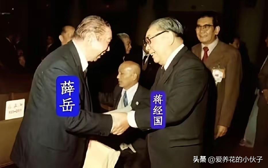 小蒋和薛将军最后一次会面 1987年在一次会议上,77岁的小蒋见到了91岁的薛将军,他亲切的和薛将军握手,被记者抓拍到这珍贵瞬间,留下这张珍贵合影!薛老将军虽然已经91岁高龄,依然很谦虚的弯下腰!他和小蒋中间的那位光头是谁?有知道的么?