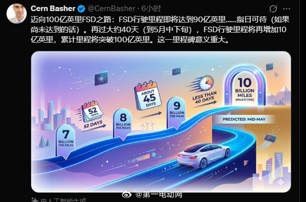 到五月下旬,特斯拉FSD 累计里程将突破100亿英里,达到此前马斯克提到的里程碑