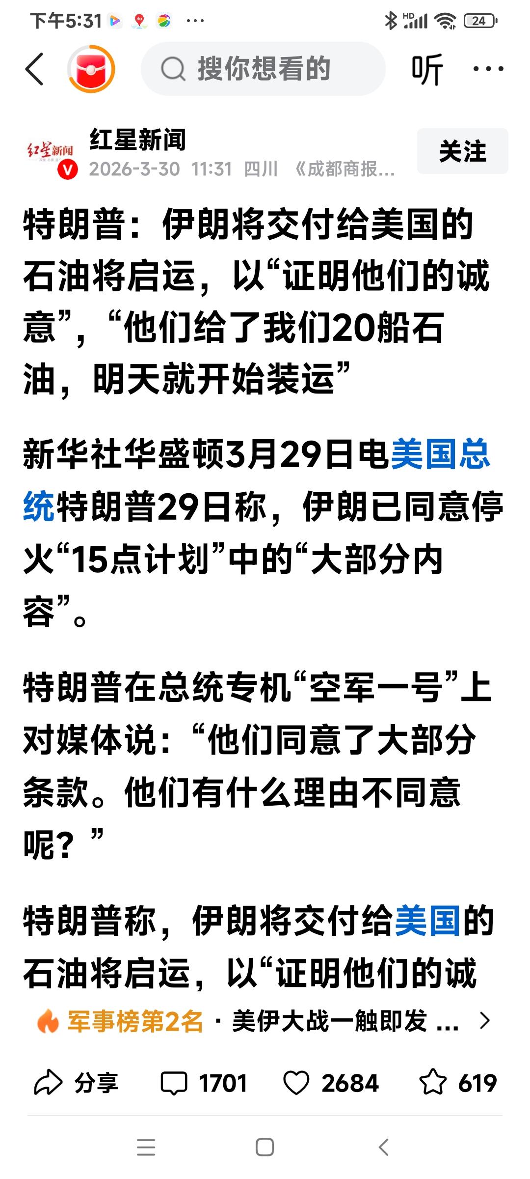 美军或可轻松拿下哈尔格岛并长期驻扎 《纽约时报》消息,美国总统特朗普3月29日在白宫大草坪接受媒体采访时亲口表示,第82空降师的数千名士兵将于近期抵达波斯湾或将参与在霍尔木兹海峡发起的地面进攻。 特朗普指出,华盛顿或许会控制哈尔格岛,也可能还将控制其余位于霍尔木兹海峡的重要岛屿,美军目前具备诸多军事选项,会择取最优方式达成战略目标。 特朗普还表示,位于波斯湾关键位置的哈尔格岛其军事防御“非常薄弱”,美军可以轻松将其拿下,并悉数控制该岛全部的石油设施。 特朗普还进一步透露,他更倾向于按照委内瑞拉模式,以“接管方式”获得德黑兰的石油开发权,如果美军需要为此占据哈尔格岛,他愿意正式下达地面作战的相关命令。 《红星新闻》也报道,特朗普29日在总统专机“空军一号”上对媒体说:“他们同意了大部分条款。他们有什么理由不同意呢?” 特朗普称,伊朗将交付给美国的石油将启运,以“证明他们的诚意”。“他们给了我们20船石油,明天就开始装运。” 特朗普称,他仍在考虑是否夺取伊朗石油出口的枢纽哈尔克岛,美军可能需要在该岛长期驻扎。
