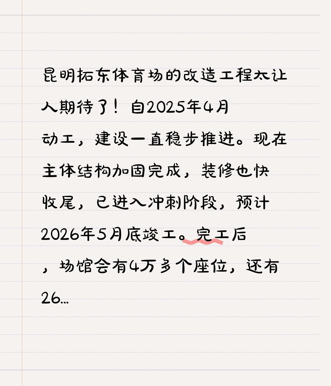 📍昆明拓东体育场的改造工程太让人期待了! 自2025年4月动工,建设一直稳步推进。现在主体结构加固完成,装修也快收尾,已进入冲刺阶段,预计2026年5月底竣工。 完工后,场馆会有4万多个座位,还有26个疏散通道。这意味着以后看比赛、搞活动,大家能舒舒服服地坐着,安全也有保障。不管是专业体育赛事,还是全民健身活动,甚至文娱演出,它都能轻松hold住。感觉以后昆明又多了个超棒的活动场所,就等着它正式开放啦!