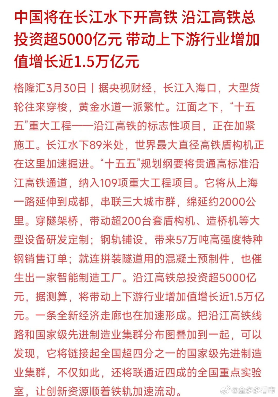 超级大利好来了,长江下面建高铁,总投资5千亿A股还在交易,但是超级大利好来了,总带动1.5万亿的发展,长江下面建高铁,想想都刺激。先不说这次投资的总规模,就是这个说法都感觉高端,也就咱们基建狂魔能够建的出来,这将是一次伟大的工程。