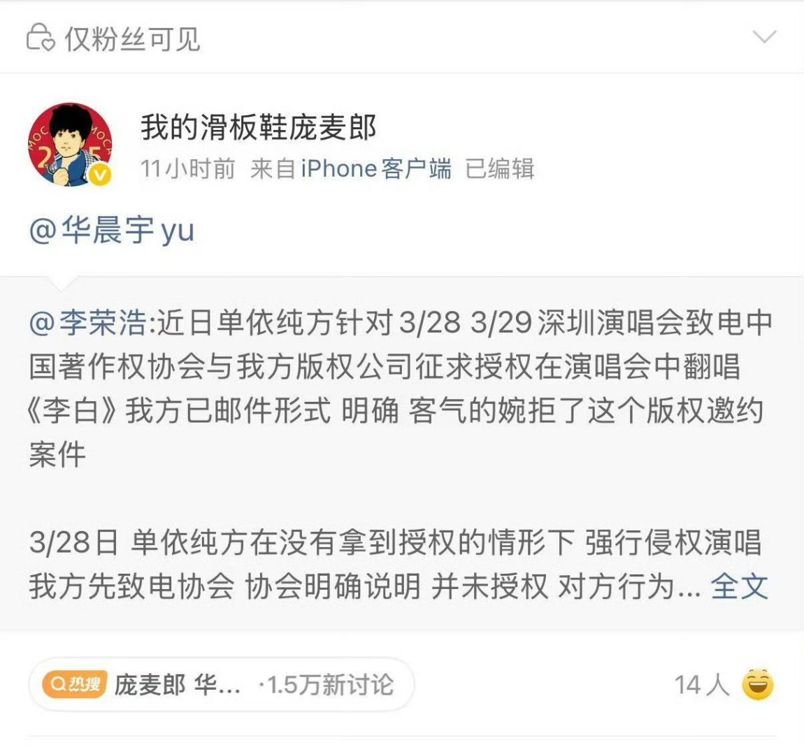 庞麦郎再转发李荣浩庞麦郎转发李荣浩维权单依纯侵权演唱《李白》的微博,艾特华晨宇,引发争议