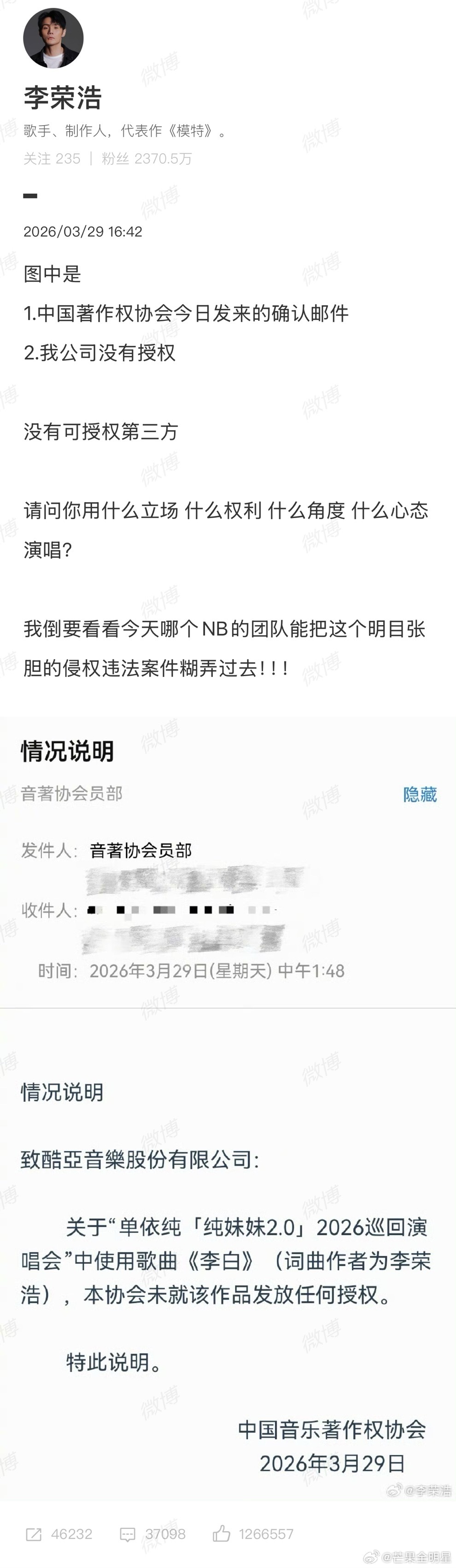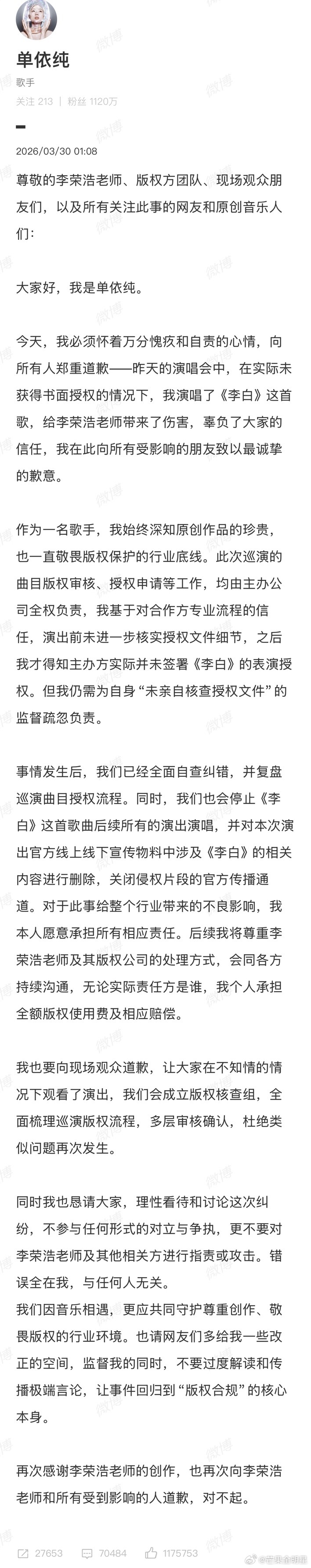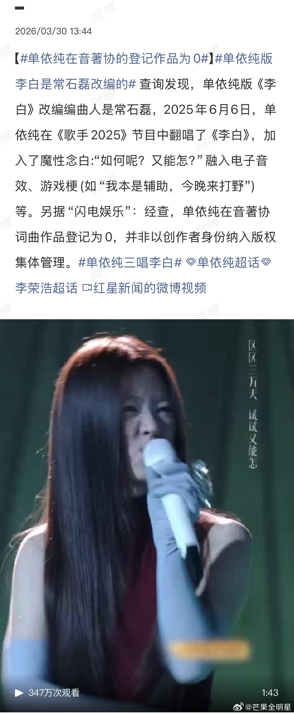 单依纯在音著协的登记作品为0就这水平还碰瓷李荣浩呢改编的《李白》难听死了,李荣浩不告她就不错了,没有版权还敢在演唱会唱,也不知道猎奇的受众群体是谁