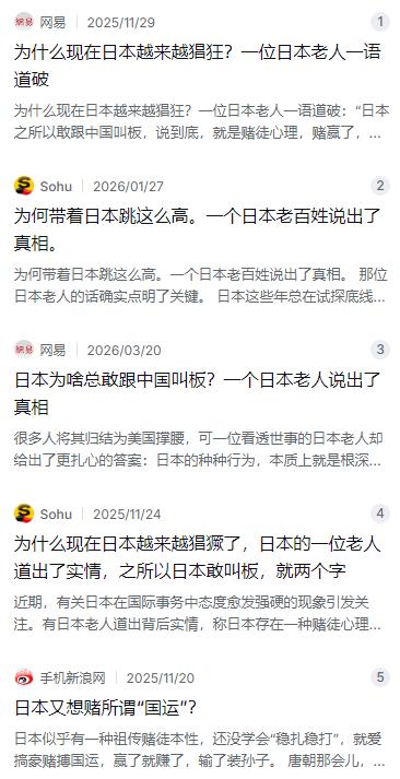 为什么现在日本越来越猖狂?一位日本老人一语道破:“日本之所以敢跟中国叫板,说到底,就是赌徒心理,赌赢了,一步登天,赌输了,大不了缩回岛上。” 麻烦看官老爷们右上角点击一下“关注”,既方便您进行讨论和分享,又能给您带来不一样的参与感,感谢您的支持! 最近这几年,日本在国际上越来越不消停。在台湾问题上频频放狠话,什么“台湾有事就是日本有事”,搞得好像台海局势直接关系到他们死活似的。很多人把这种现象归结为美国在背后撑腰,但有个活到九十多岁的日本老人,一针见血地戳破了这层窗户纸。他说,日本之所以敢跟中国叫板,说到底就是赌徒心理——赌赢了,一步登天;赌输了,大不了缩回岛上。这话听起来像是酒桌上的自嘲,但细想想,还真把日本的毛病说透了。 日本这种赌徒思维,不是一天两天养成的,而是刻进了骨子里的毛病。从一百多年前的甲午战争开始,日本就把“以小博大”这套玩得贼溜。1894年那会儿,大清帝国看着还是个体量庞大的巨人,北洋水师铁甲舰林立,号称亚洲第一。日本当时经济萧条,军备也不足,可他们愣是瞅准了时机,在朝鲜半岛海面不宣而战,悍然挑起了甲午战争。结果还真让他们赌赢了,清朝惨败,被迫签了丧权辱国的《马关条约》,赔了2亿两白银,还割了台湾和澎湖。这笔赔款相当于日本当时三年多的财政收入,直接成了日本工业化的第一桶金。明治维新折腾了那么多年没搞定的工业化,靠着一场战争赌局,全解决了。从那以后,日本上上下下就形成了一个要命的认知:冒险来钱快,打仗能翻身。 尝到甜头之后,日本的赌瘾就一发不可收拾了。1904年,他们又把全部家当押上,这回挑战的是横跨欧亚的沙皇俄国。沙俄兵源充足,领土辽阔,怎么看都不是日本能惹的对手。可日本就是敢动手,2月8日晚上,日本海军联合舰队在总司令东乡平八郎率领下,不宣而战,偷袭了驻扎在旅顺口的俄国舰队。经过一系列恶战,日本竟然又赢了。这一下,日本的赌徒心理彻底失控了,连续两次以小博大成功,让他们觉得自己是天选之子,什么大国强国都不在话下。 最疯狂的一次,当属1941年偷袭珍珠港。那时候日本已经深陷中国战场无法自拔,石油、钢铁这些战略物资全靠进口,光石油就有八成以上依赖美国供应。美国一搞石油禁运,日本就慌了神。海军军令部总长永野修身说得直白:石油储备只够用一年半,没油了,联合舰队就是一堆废铁。在这种情况下,日本高层不是想着收手止损,而是决定再赌一把更大的。1941年12月7日清晨,日本六艘航母搭载四百多架舰载机,偷袭了美国太平洋舰队基地珍珠港。日本在战术上确实赢了,美军损失惨重。可在战略上,这一把直接把美国拉进了二战。美国的工业机器一开动,粗钢产量是日本的13倍,石油产量是日本的一百多倍,日本那点家底根本不够看。最终结果大家都知道,广岛长崎两颗原子弹把日本炸回了原形,本土沦为一片废墟,天皇低头认输。那位日本老人说得没错,日本历史上已经习惯了这种来回跳,输了就缩回岛上,隔几年再重新冒头。 可问题是,这帮人根本没从历史里吸取教训。到了2020年代,日本右翼势力的赌徒心态又开始抬头了。2025年10月,高市早苗上台当了首相。上任不到一个月,她就在国会公然放话,说台湾要是出事,对日本来说就是“存亡危机事态”,暗示可能要武力介入台海。这话一出,中国这边立刻强烈抗议。高市早苗也成为1945年日本投降以来,第一个在任期间公然释放武装干涉台海政策信号的首相,这已经不是在试探底线了,而是直接踩红线。他们到底在赌什么?赌中美关系继续僵持,赌美国会替他们兜底,赌中国在台海问题上会有所顾忌。赌赢了,日本就能趁机刷存在感,重塑在亚洲的影响力;赌输了,就像那位日本老人说的,“大不了缩回岛上”。 可日本人这回怕是打错了算盘。现在的中国,可不是一百多年前的大清朝,也不是当年的北洋水师。中国的经济体量世界第二,军事实力更是今非昔比。在外交上,中国已经多次严正交涉,明确指出日方的涉台言论违背了《中日联合声明》等四个政治文件中的一中原则。在法律上,中国手里握着《反外国制裁法》,谁在台湾问题上跳得最欢,谁就得准备好挨制裁。在经济上,中日贸易体量巨大,日本对华市场依赖程度相当高,真要搞经贸反制,日本根本扛不住。在军事上,解放军的战备警巡早已常态化,东海、台海周边,舰机天天都在转。不是吓唬谁,而是告诉你,红线就是红线,踩了就得付出代价。 说到底,日本这套赌徒逻辑,最大的问题就在于它永远觉得自己输得起。可问题是,有些赌局,一旦输了,就不是“缩回岛上”那么简单了。台湾问题是中国核心利益中的核心,在这上面搞冒险,后果绝不是日本能承受的。奉劝日本政府早点清醒过来,别整天想着投机翻盘。好好看看历史,那些靠赌国运起家的,最后都落了个什么下场。再这么折腾下去,重蹈二战覆辙可不是危言耸听。