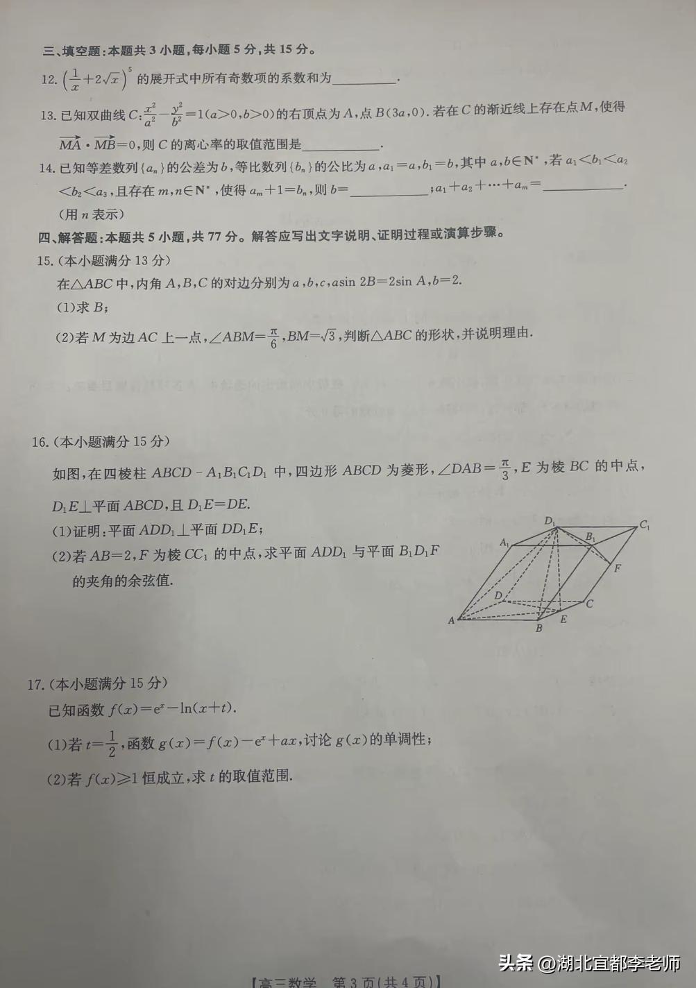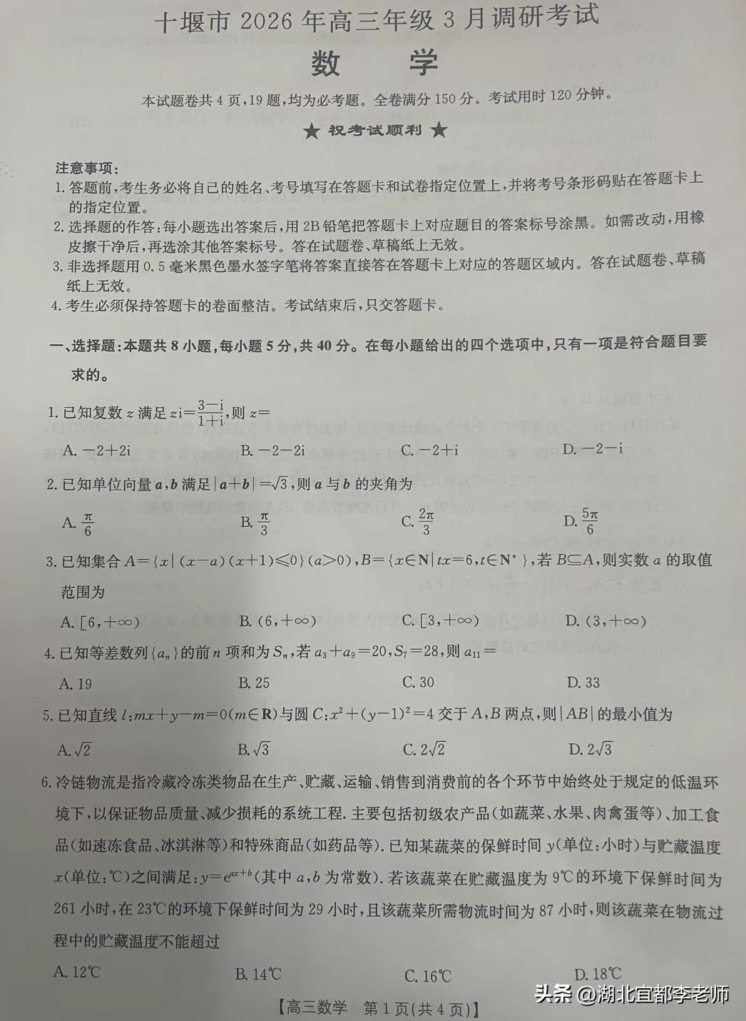 十堰高三二诊数学难度比较平和! 2026年3月30日,十堰市2026年高三年级3月调研考试(十堰二诊)开考。 今天结束第一天语文和数学的考试,下午的数学考试,整体上来说,相对比较平和,难度并不大。走过路过的十堰高三家长们,您孩子今天考得如何?欢迎大家在评论区积极交流。 我是@湖北宜都李老师,常年关注湖北高中联考和湖北升学规划,期待您的关注和点赞!