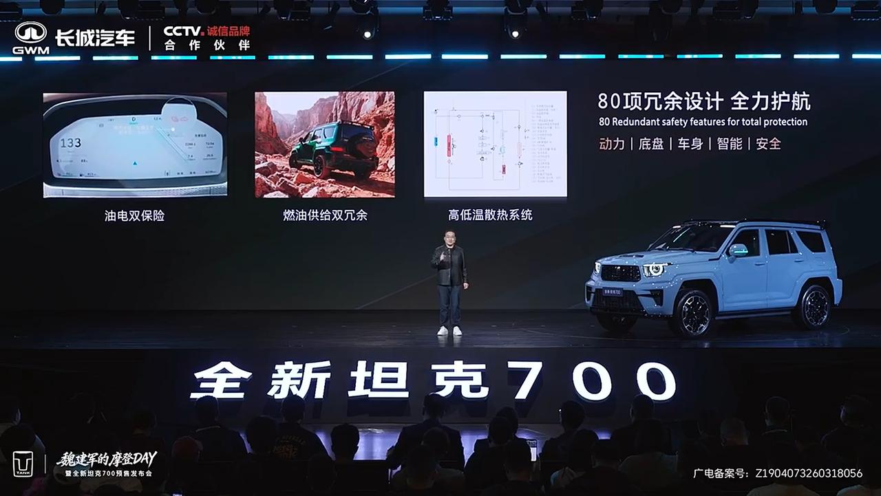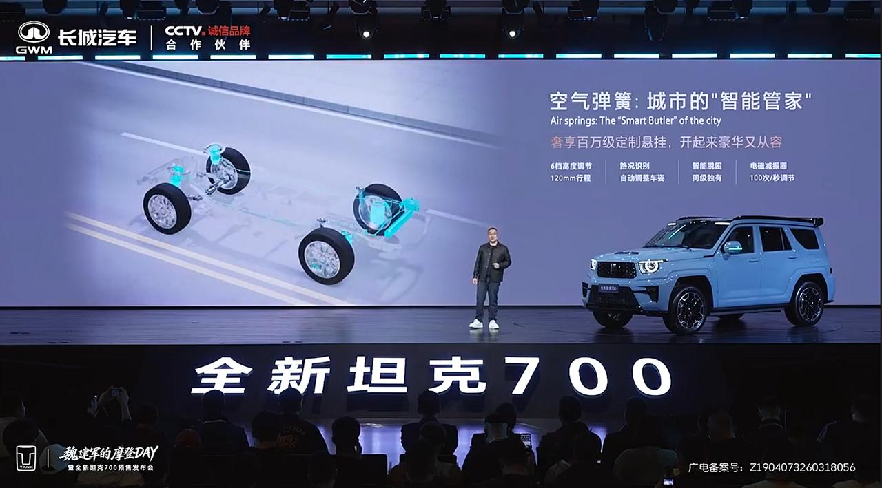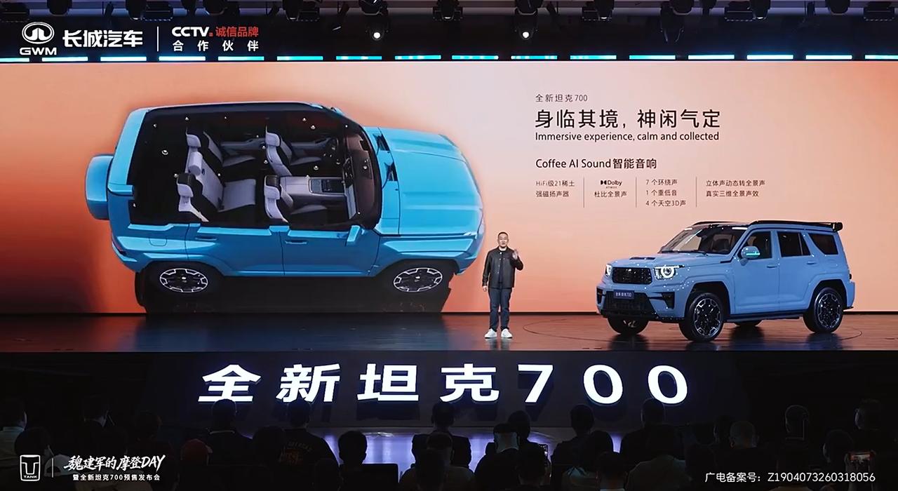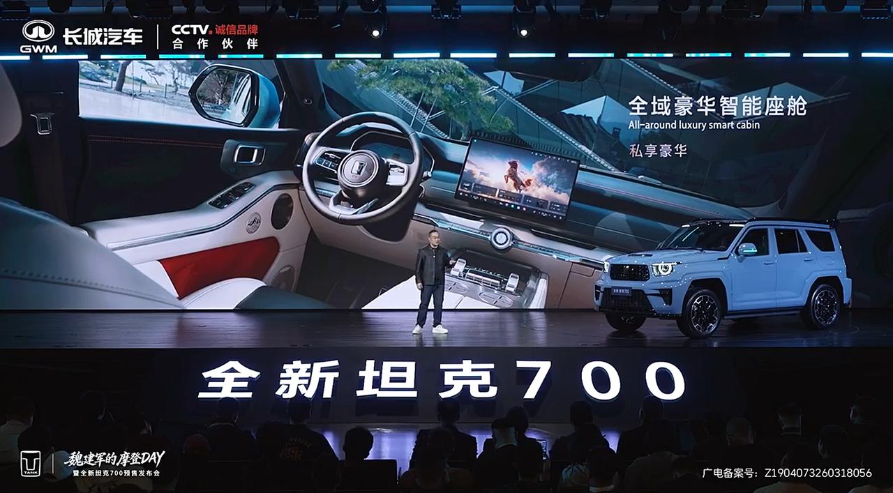期待了好久,长城坦克700终于预售了,先来看一下价格: 坦克700 Hi4-T巅峰版:51.8万元; 坦克700 Hi4-Z极境版:47.8万元; 坦克700 Hi4-Z极致版:43.8万元。 按照惯例,该车实际上市时,零售价还会降数千元到数万元。 看完价格来聊一下配置,坦克700虽然延续了越野车的定位,高配版搭载3.0T发动机,低配版也有2.0T发动机,但是它并不是完全面向越野用户。 智驾、座舱、音响、座椅等方面,坦克700丝毫没有减配,全车标配座椅通风/加热/按摩、HiFi级21稀土强磁扬声器、7屏联动、VLA+世界模型、冷暖冰箱等配置。 这几款车的区别在于,Hi4-T版本动力为3.0T,Hi4-Z版本动力为2.0T,而且提供螺旋弹簧和空气弹簧两套减震系统可选。该车还有许多细节并未透露,估计要等到上市发布会才会公布。 坦克700基于插混动力,WLTC工况下续航可达190公里,日常使用出行成本与常规SUV没有太大差别,无论是为家庭考虑,还是热爱越野,坦克700都是值得考虑的产品。 全新坦克700新时代新旗舰