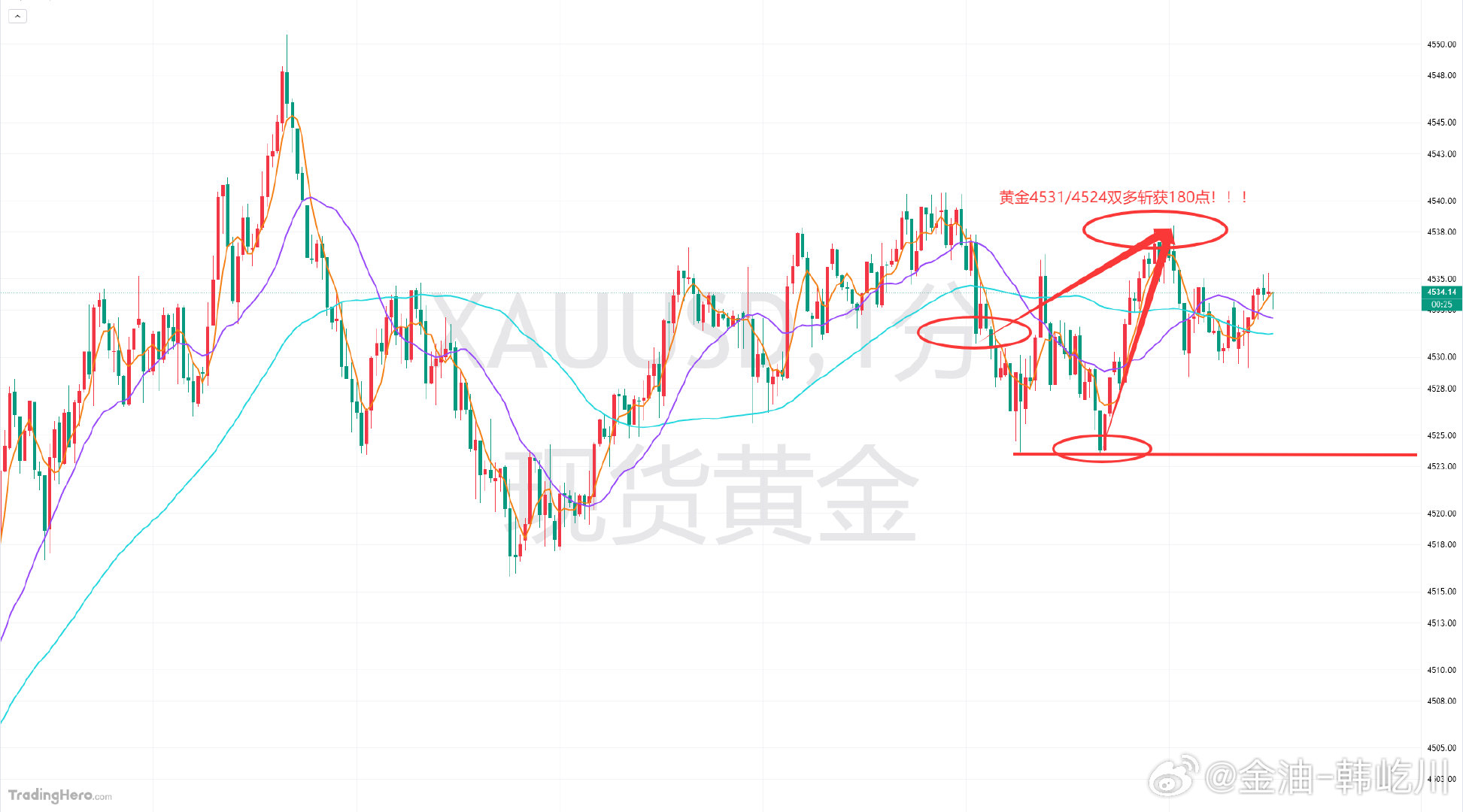 黄金靠近4540回压,本轮分享给到4531/4524的双多单,抵达4537附近,收获直接拿下180点!日内“四”连胜!!