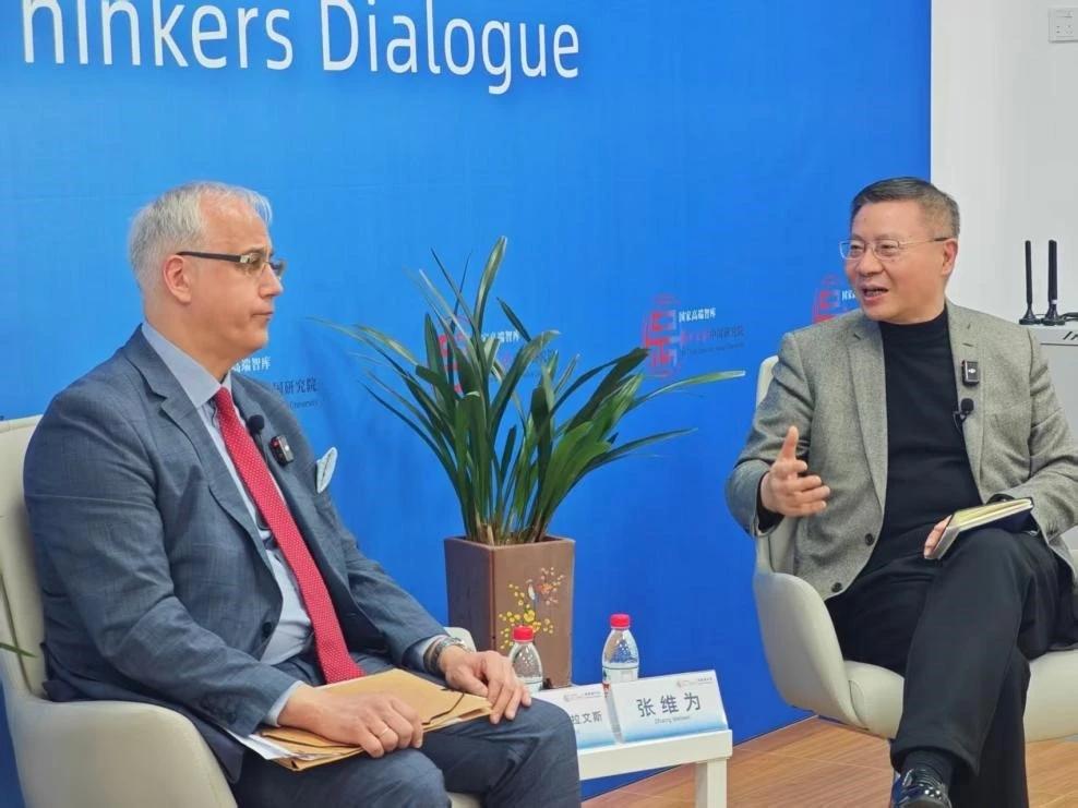 张维为教授的研究院在3月27日又迎来了一位贵客,来的不是旁人,来的是克拉文斯教授。 克拉文斯教授谈到了辩证法的活力。张教授表示支持,并说我们很多成语里面都有辩证法思想,如“物极必反”等。 演讲过后,张教授与克拉文斯教授等人合影留念。这场跨文化对话,为学术交流再添新篇。