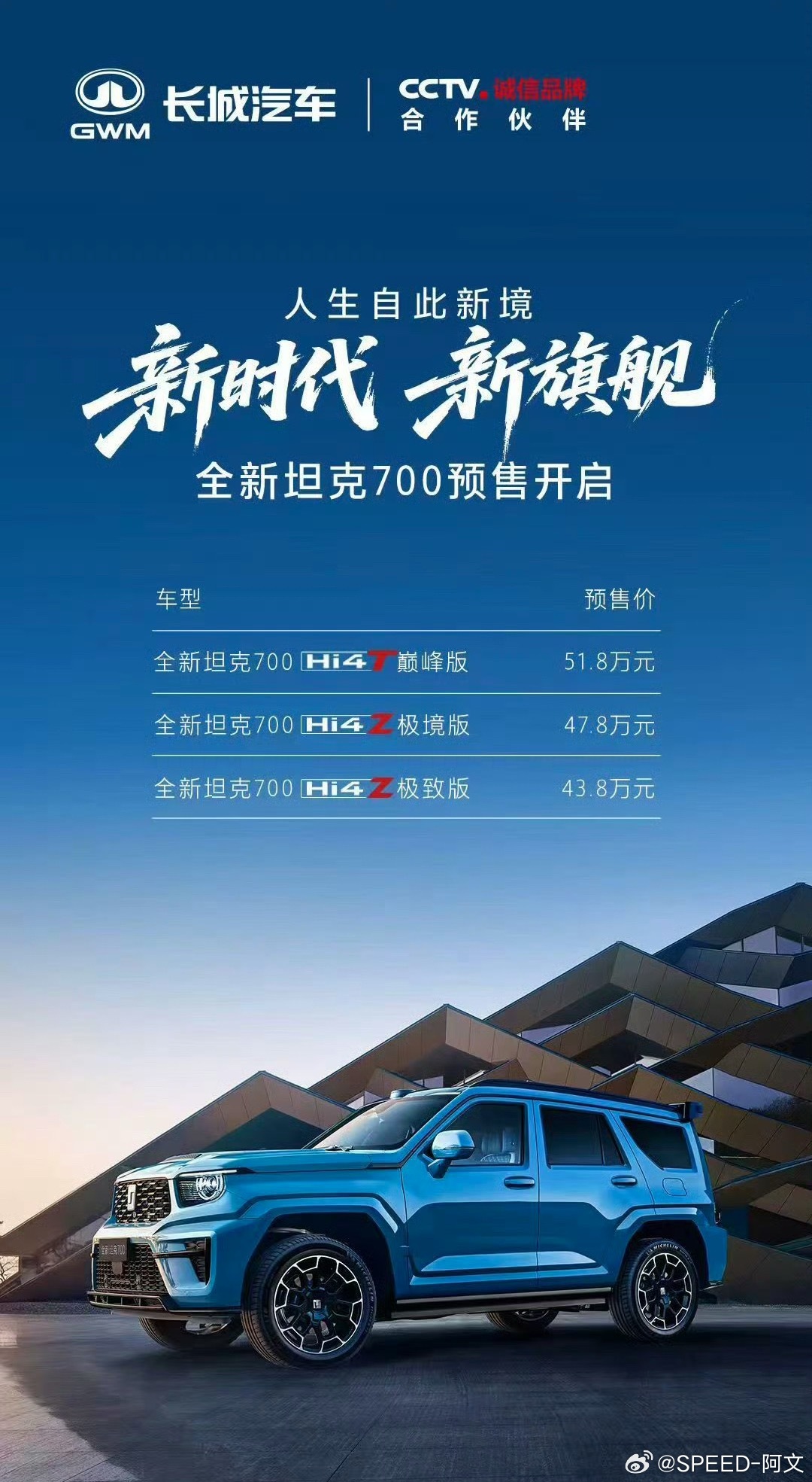 全新坦克700预售价来了这个价格对于长城旗舰来说相当可以啊!2.0T HiZ已经能满足大部分可家可玩的需求汽场全开全新坦克700预售43.8万元起