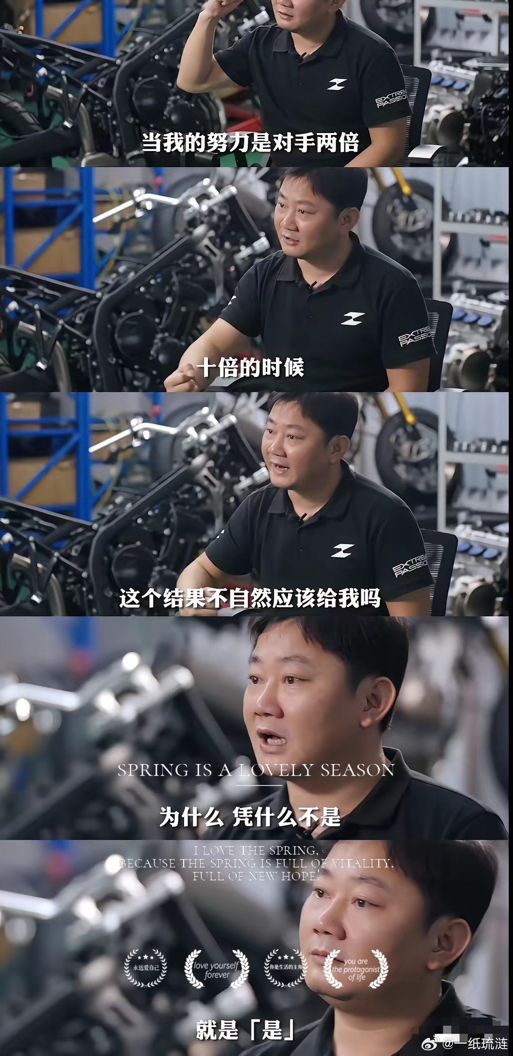 朋友问我,国内比张雪机车先成立,规模大的摩托车厂商多了去了,为什么偏偏是才成立两年的张雪机车两次夺冠,创造历史?我告诉朋友,你看了张雪老板的经历,明白了。他草根出身,身高只有一米六,没有任何优势,却立志要当赛车手,没有钱,就当修车工一分一分攒,买不起新车,就买快报废的二手车,没有专业场地,就到田坎土坡上练,没有车队,就找电视台曝光,那天天公都不作美,下着大雨,寒风凛凛,他一次次摔倒,一次次爬起来,满脸泥泞,身上湿透,手冻得发紫,却从未说放弃,最后连电视台都被他的精神打动了。创立凯越后,公司刚有点钱,他就立志要造自己的发动机,这不是儿戏,要花很多钱,还不一定会成功,搞不好公司都会被拖垮,面对所有人都不理解,他毅然决然选择了辞职。成立张雪,他砸下所有身家,从头再来,所有人都不看好,有人劝他,拿着这些钱不折腾下半生衣食无忧,但他力排众议,为了省钱,他从来没给自己买过奢侈品,用的手机从来不超过两千块,上下班也是骑着小踏板,但是为了验证摩托车的一个参数,报废的模具动辄大几十万,他却眼镜都不咋一下。他说,有梦想就去追。他说,当我比别人努力多2倍10倍,凭什么好的结果不能是我的,就是我的。靠着这份热爱,靠着这份不服输的精神,他做到了。所以,凭什么不能是他?这份殊荣,他当之无愧。