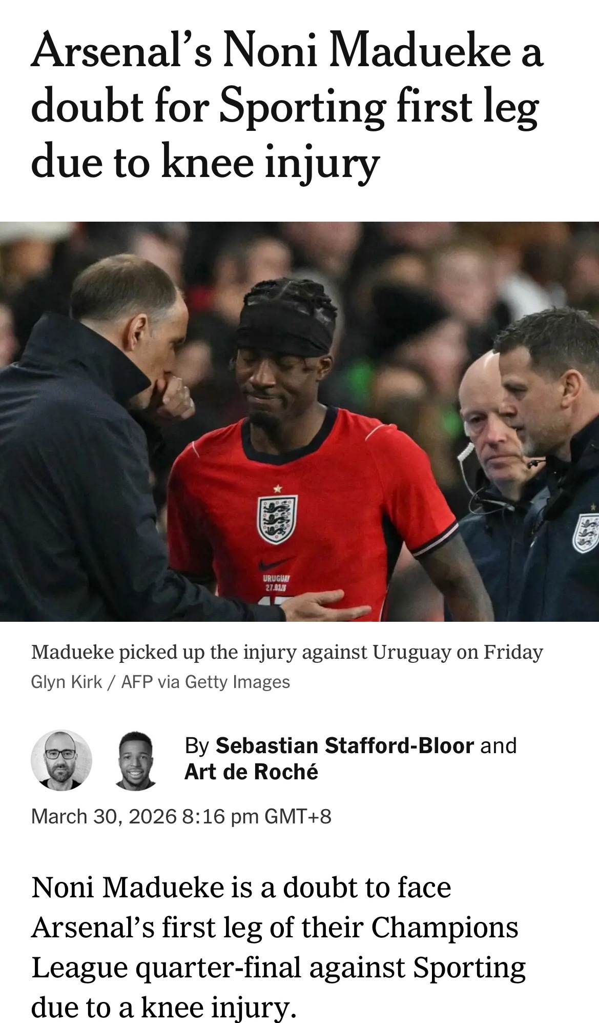 The Athletic:英格兰上一场比赛后,马杜埃凯左膝戴着护具穿过温布利的媒体混合采访区,引发了对他伤势严重的担忧。然而,据了解伤情的消息人士透露,他们认为马杜埃凯问题不大,他很可能错过对阵南安普顿的足总杯四分之一决赛,并可能缺席欧冠四分之一决赛对阵葡萄牙体育的首回合。